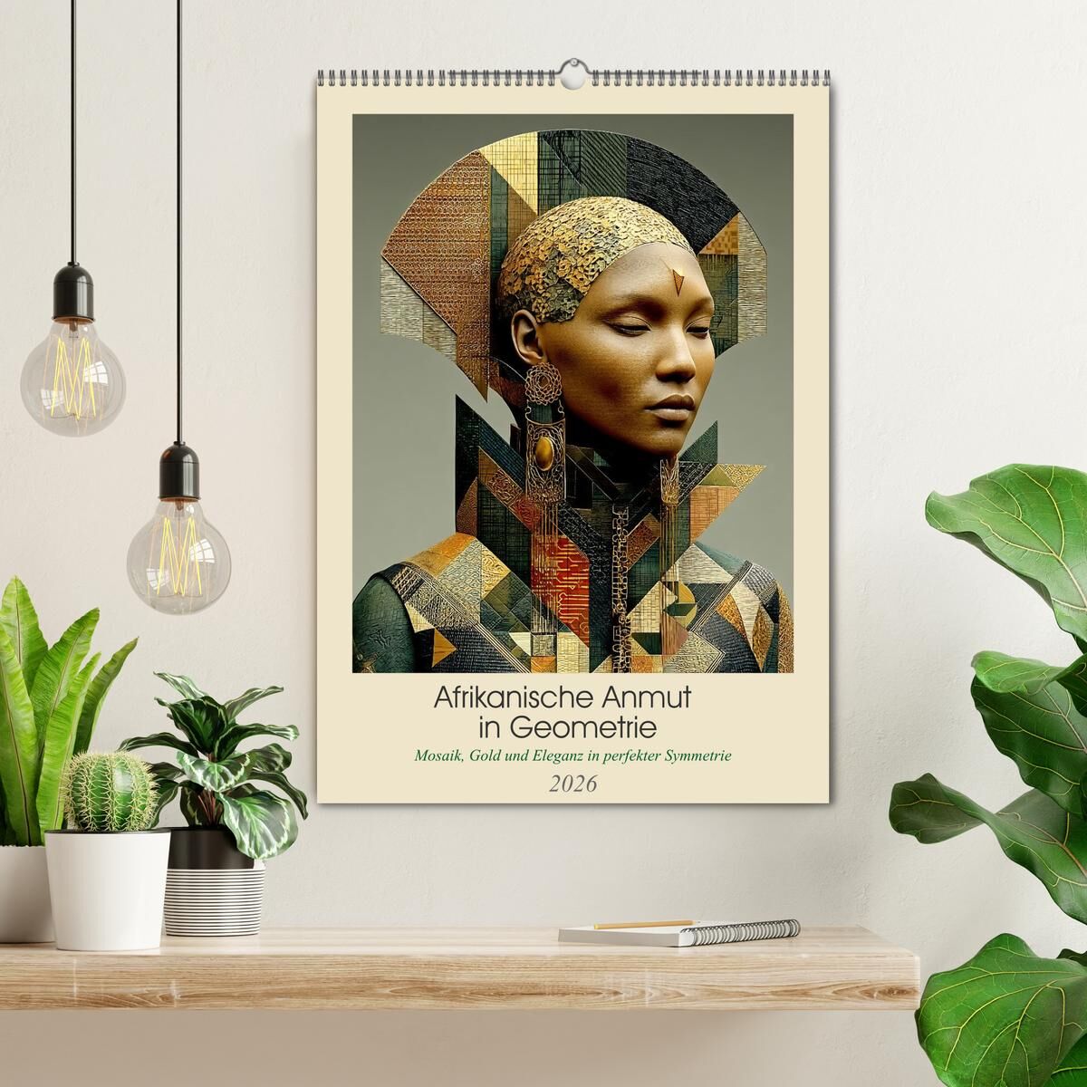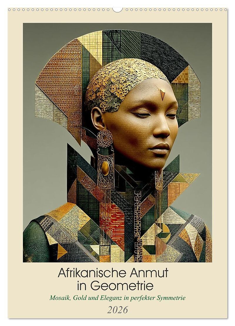 Afrika trifft Geometrie modern interpretiert. Die ausdrucksstarken Figuren, inspiriert von afrikanischer Ästhetik, stehen im Zentrum dieses Wandkalenders. Gefertigt aus Mosaik, Gold und Metall, tragen sie geometrische Gewänder in Schwarz, Weiß und Gold. Ihre H...