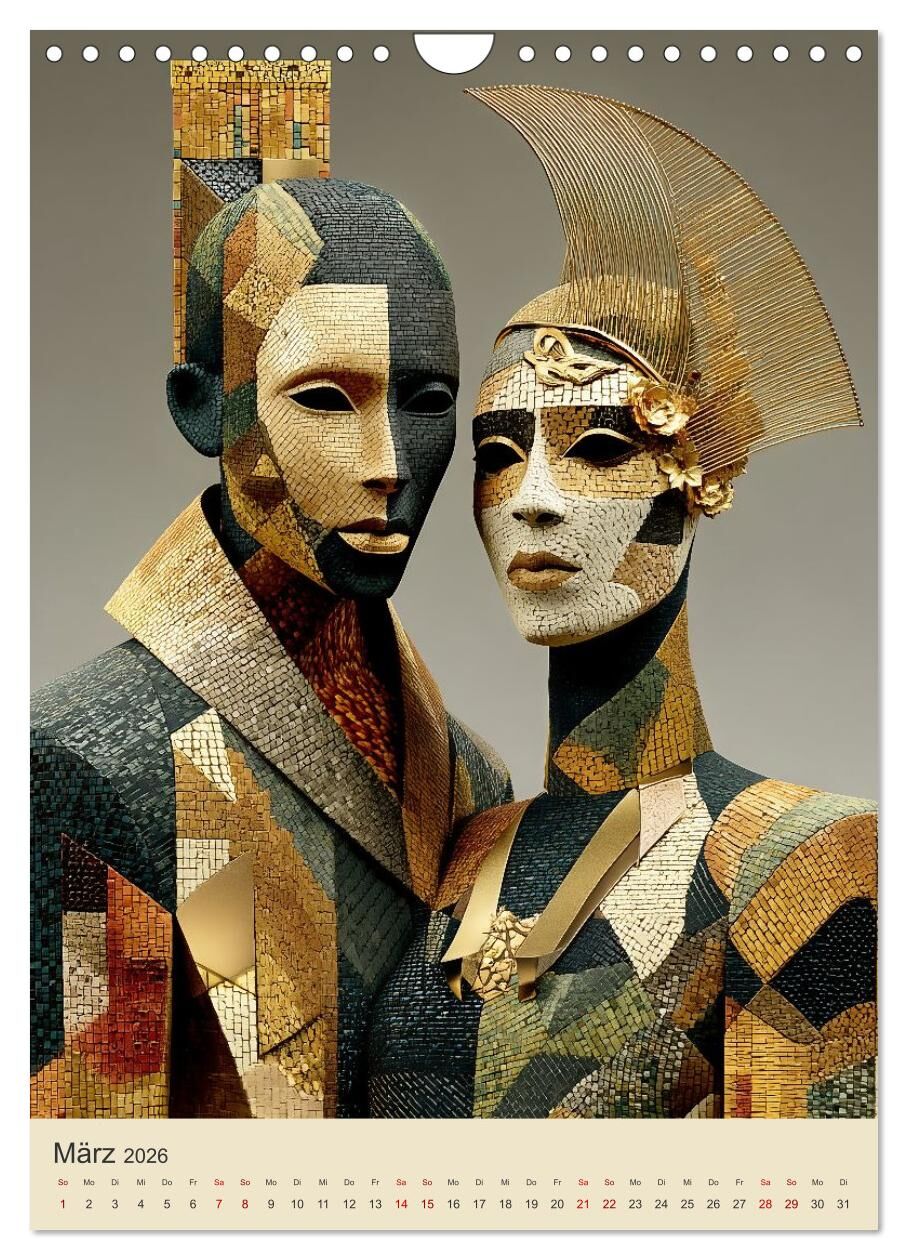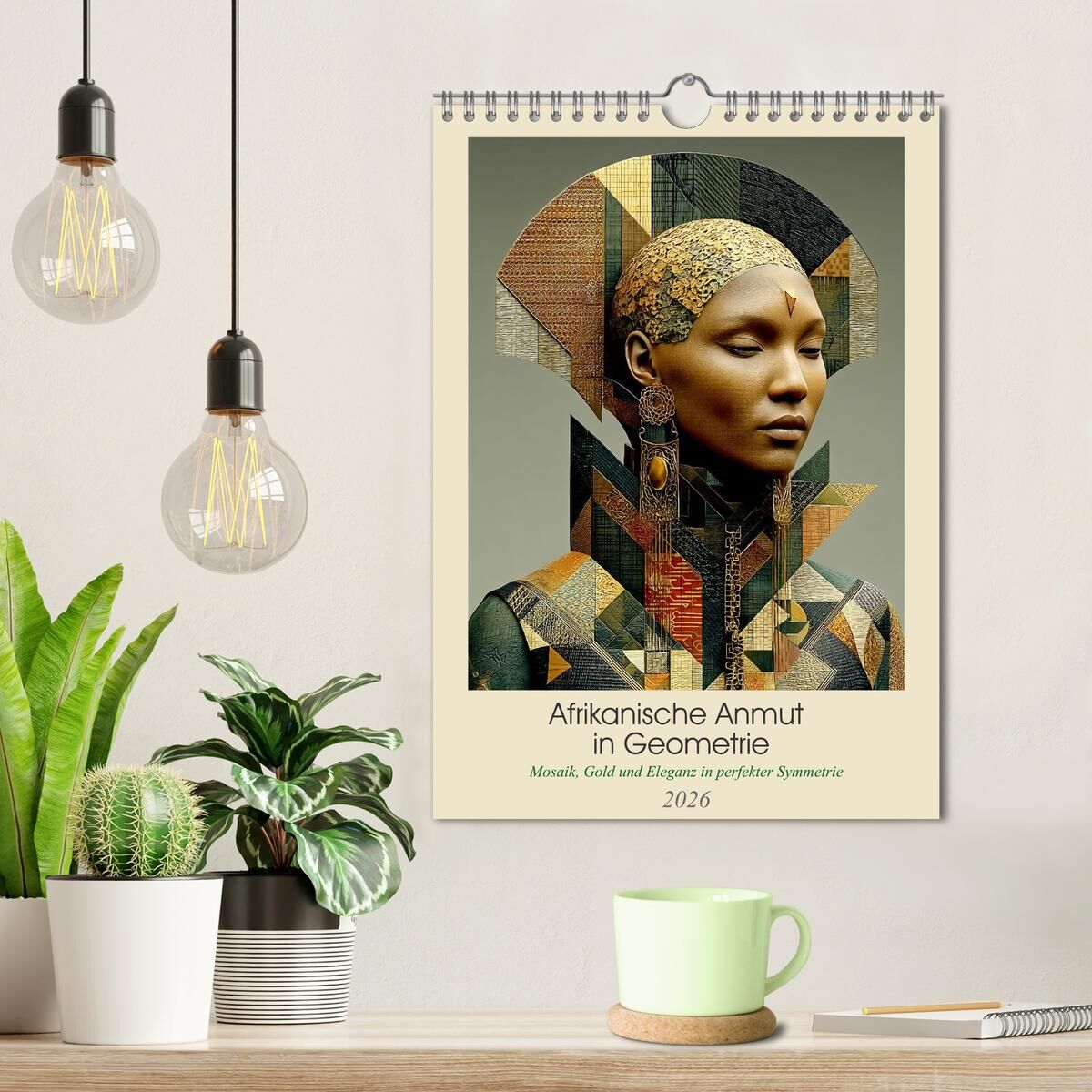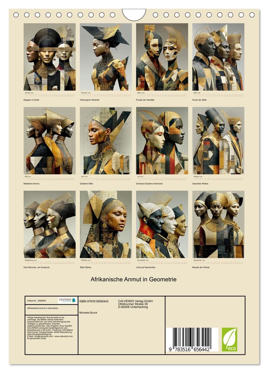 Afrika trifft Geometrie modern interpretiert. Die ausdrucksstarken Figuren, inspiriert von afrikanischer Ästhetik, stehen im Zentrum dieses Wandkalenders. Gefertigt aus Mosaik, Gold und Metall, tragen sie geometrische Gewänder in Schwarz, Weiß und Gold. Ihre H...