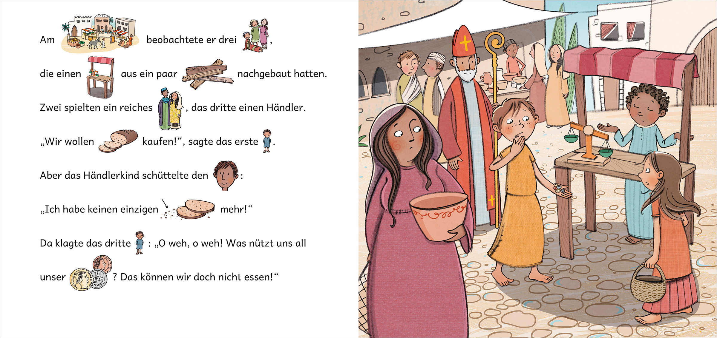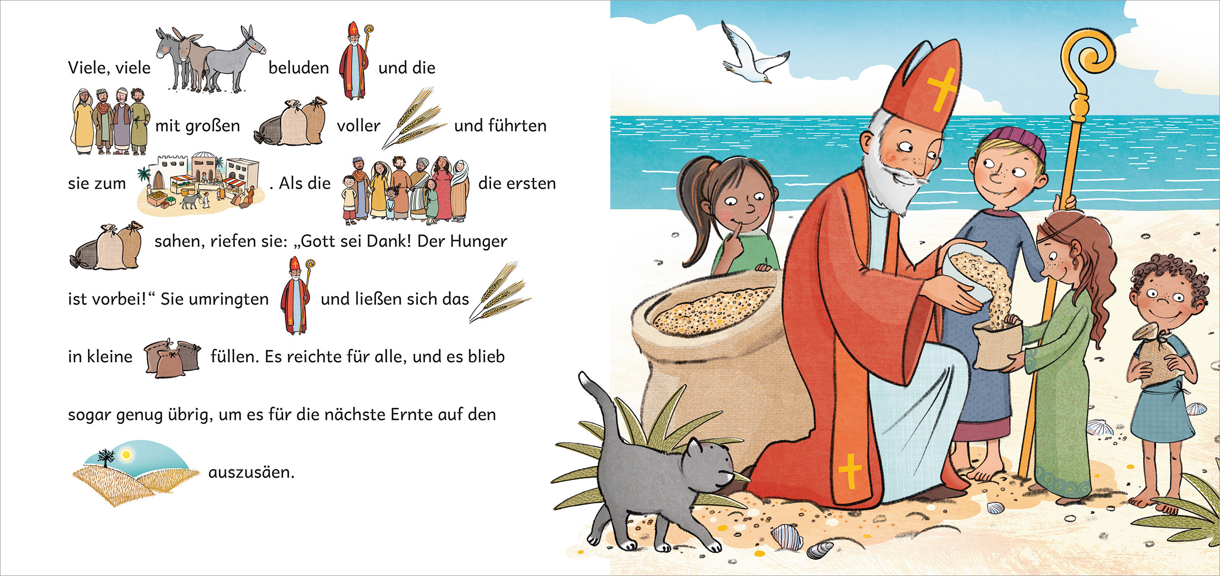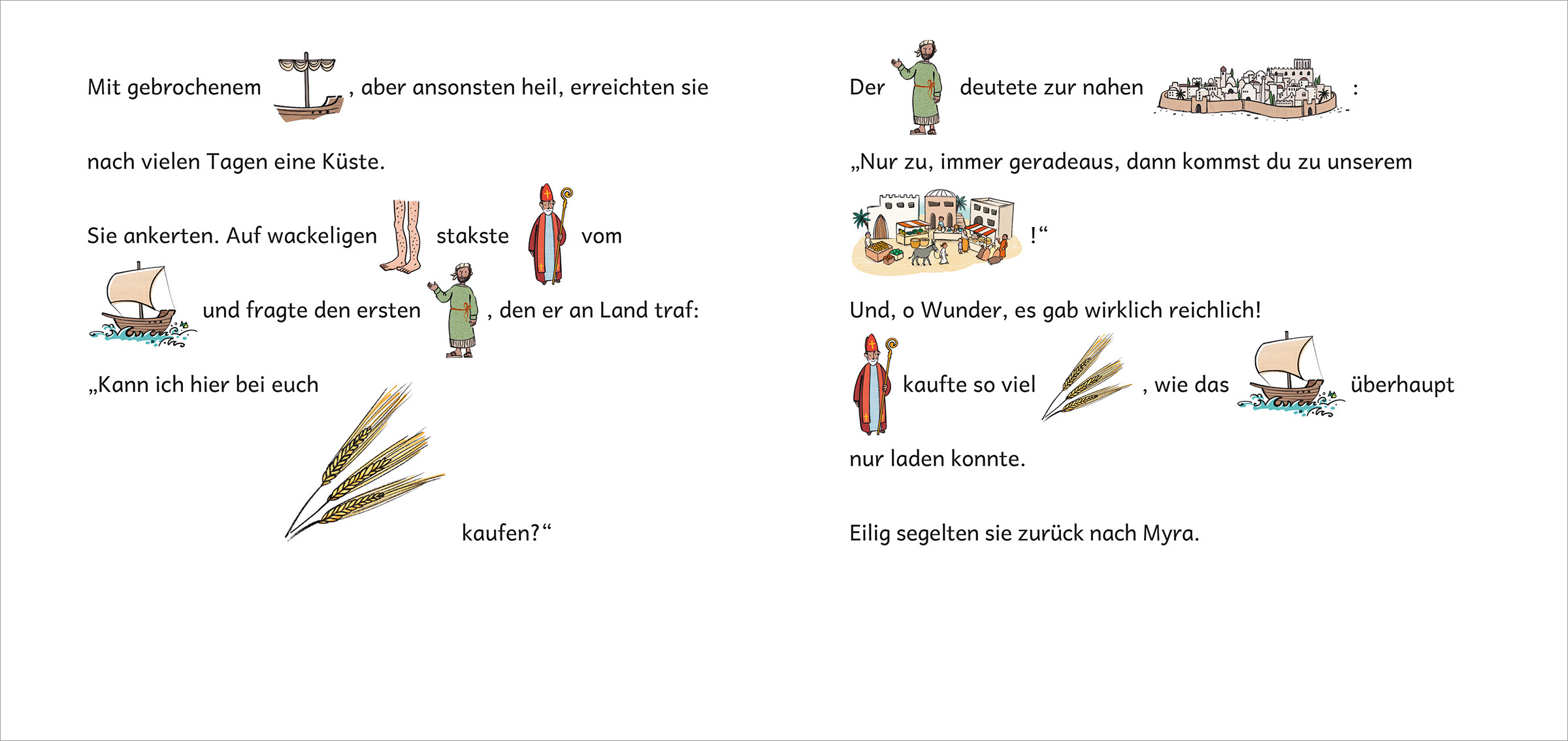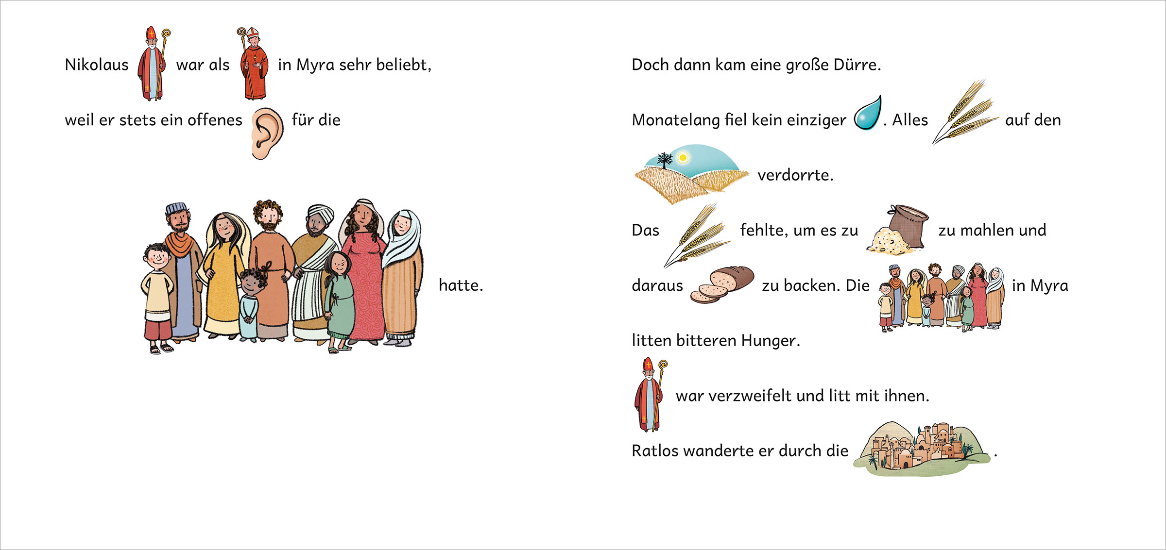 In einfachen und kurzen Sätzen erzählt die Geschichte von Nikolaus davon, wie Nikolaus sein Geld mit den Armen teilte, wie er in einem besonders heißen und dürren Sommer für genügend Getreide sorgte und die Menschen so vor einer Hungersnot rettete und was er ...