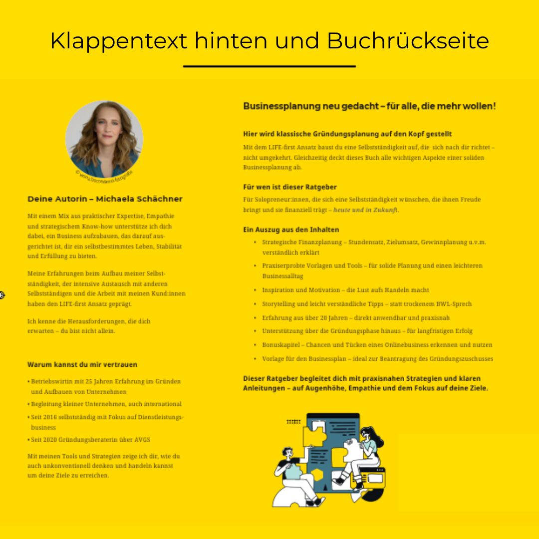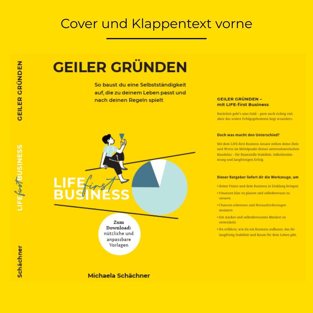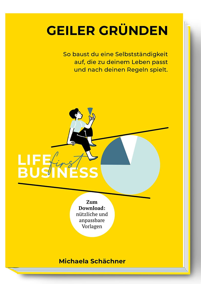 INHALTSVERZEICHNIS 14 Einführung 20 Kapitel 1 der Traum vom Business 22 LIFE-first Business by Michaela Schächner® 22 Ein disruptiver Ansatz für ganzheitliches Unternehmertum 22 So funktioniert LIFE-first!® 23 LIFE-first Business dein Wunschleben, die Finanzen und das Geschäftsmodell im Einklang 24 LIFE-first als bewusste Gegenbewegung zur Philosophie der Work-Life-Balance 25 Die Säulen eines LIFE-first Business 26 Bedeutet LIFE-first wenn jeder an sich denkt, ist an alle gedacht 27 DEIN Wunschleben 27 Warum es wichtig ist, dass du dir über DEIN Wunschleben Gedanken machst 27 Warum LIFE-first in Zeiten von Unsicherheit gebraucht wird 31 Wie viel kostet dein Wunschleben und woher kommt das Geld 32 Der Lifestyle-Gage-Rechner so berechnest du die Kosten für dein Wunschleben und deinen Zielgewinn im Business 34 Warum möchtest du selbstständig sein 34 Weg von oder/und hin zu wieso es wichtig ist, zu wissen, was dich antreibt 36 Dein WARUM macht dich stark und attraktiv 41 Hobby oder Business wie groß musst du denken 43 Erstelle dein Vision-Board 44SelbstreflexionzumKapitelTraumvomBusiness 46Kapitel 2 vom Traum zur Realität 48 Starte mit der rosaroten Brille 49 Was sagen nur die anderen 53 Das Ticket für die Persönlichkeitsentwicklung ist mit im Paket 53 Was ist, wenn der Businessplan sagt, die Geschäftsidee funktioniert nicht 55 Ab wann bist du Unternehmer:in 61 Herausforderungen erkennen und lösen 62 1000 Hüte auf und die Frage, was dich wirklich weiterbringt 63 Mut zur Sichtbarkeit und Lust am Verkaufen 63 Einfach mal machen 64 Money-Mindset 67 Nein zur Altersarmut und mangelnder Wertschätzung 71 Gründung aus der Arbeitslosigkeit 71 AVGS-Coaching 100% Förderung deines Gründercoaching durch die Agentur für Arbeit 72 Ein AVGS und der Gründungszuschuss sind nicht aneinandergekoppelt 72 Gründungszuschuss finanzielle Starthilfe 73 Scheitern/Abbrechen von Existenzgründungen 74 Einige, der häufig genannten Gründe für Scheitern sind 76 Exkurs Husband-Excuse, die Gefahr einer vollen Spardose und die Bedeutung von Kill-Criteria und Abbruch-Meilensteinen 77 Erkenne das Wachstumspotenzial in Veränderungen und Umwegen 78 Nochmal ein starkes WARUM verleiht dir Flügel 79 Der Weg zu meinem WARUM und die Geburt von LIFE-first 82SelbstreflexionzumKapitelVomTraumzurRealität 84 Kapitel 3 Vorbereitung der Gründung 86 Streifzug durch administrative und rechtliche Themen 87 Rechtsform, Behörden, Anmeldungen, Genehmigungen & Co. 87 Wahl der Rechtsform 90 Entscheidungshilfe bei Mischfällen 91 Das Finanzamt und deine Steuern ein Überblick 92 Die steuerliche Erfassung 93 Steuerarten 97 Diverse Genehmigungen und Regelungen 99 Geschäftskonto 101 Fördermöglichkeiten für Gründer:innen Überblick 102 Fragen rund um die Krankenversicherung 102 Krankenkasse privat oder gesetzlich wie absichern im Krankheitsfall 103 Stichworte, die dir bei der Vorbereitung deiner Entscheidung helfen können 105 Noch mehr Versicherungen und Scheinselbstständigkeit 105 Künstlersozialkasse (KSK) - betrifft auch dich 109 Rentenversicherung 110 Arbeitslosenversicherung 110 Allgemeine betriebliche und persönliche Versicherungen 115 Scheinselbstständigkeit in Bezug auf Versicherungspflicht in der Sozialversicherung 117 Dein Begleiter auf dem Weg der Businessplan 117 Wozu der Aufwand 125 Wieso gibt es einen Text- und einen Zahlenteil 126 Mit den Zahlen spielen 130 Feedbackgeber:innen zum Businessplan wer hilft wirklich 135SelbstreflexionzumKapitel3VorbereitungderGründung 138Kapitel 4 das erste Jahr und danach 140 Jetzt geht es los nach der Gründung 140 Feier dich und deinen Mut 140 Die Falle von Blaupausen, die dich vom Weg abbringen können 141 Fokus, Fokus, Fokus 142 Prioritäten versus Perfektionismus am ausführlichen Beispiel Webseite 143 Deine Webseite ein lebendiges Projekt 144 Feintuning und Markenentwicklung 150 Entwicklungsphasen deines Unternehmens 150 Lebenszyklus eines Unternehmens 151 Fünf Phasen im Lebenszyklus eines Solopreneurbusiness 153 Von Anfang an, Abläufe in Prozessen festhalten 155 Buchhaltung Beispiel-Prozess und Profi-Tipps zur Durchführung 169 Umsatzsteuervoranmeldung 174 Controlling in Maßen 176 Gewinnziel ab wann sich dein Business wirklich lohnt 178 Cashflow Management von Anfang an 180 Künstliche Intelligenz 184SelbstreflexionzumKapitelDasersteJahrunddanach 186Kapitel 5 dranbleiben und mitwachsen 188 Sei dir deiner Rollen bewusst 190 Vergiss nie, warum du dich selbstständig gemacht hast 191 Vergiss nie, welche Schätze du mitbringst 193 Mut zur Veränderung 196SelbstreflexionzumKapitelDranbleibenundMitwachsen 198Kapitel 6 Bonuskapitel Onlinebusiness Wunderkiste mit Tücken 200 ACHTUNG vor den Nebenwirkungen 200 Warum dieses Kapitel 201 Gemeinsame Wege was du aus unseren Erfahrungen lernen kannst 203 Der große Traum vom Onlinebusiness 204 Einblick in die Onlinebusinesswelt, die ich kenne im Onlinebusiness scheint vieles einfacher 205 Skalierung Gruppenprogramme und Selbstlernkurse 206 Der Run auf 6-und 7-stellige Einnahmen oder die Frage welcher Karotte läufst du hinterher 208 Mythos …
