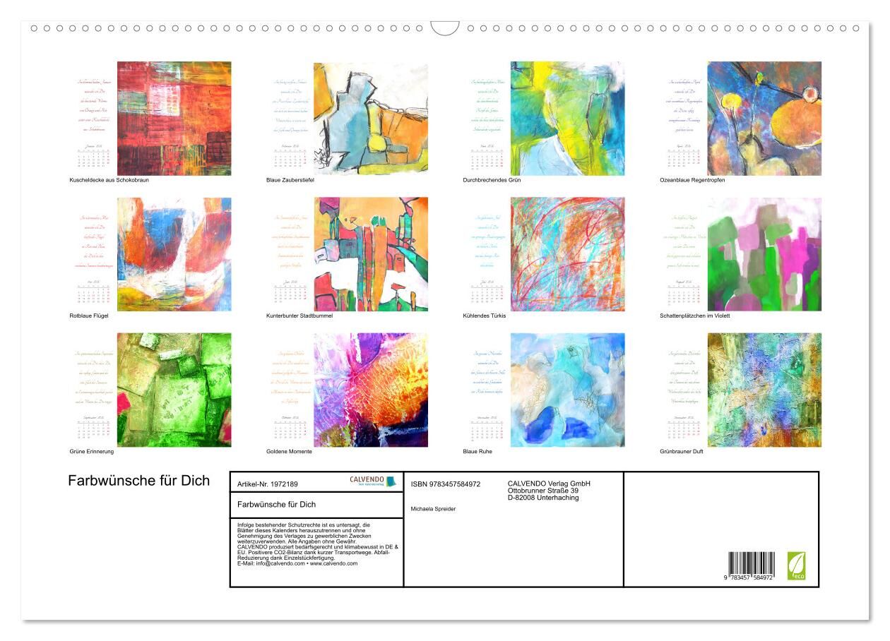 Farbwünsche für Dich ist ein liebevoll gestalteter Kunstkalender mit abstrakter Malerei in unterschiedlichsten Techniken. Die farbenprächtigen Monatsbilder werden von bunten Wünschen für den Monat begleitet. Ein besonderes Geschenk für einen besonderen Mensche...