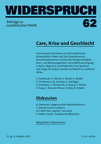 Das aktuelle WIDERSPRUCH-Heft 62 widmet sich der Care-Arbeit, also der versorgenden, betreuenden, pflegerischen Arbeit, im Kontext der aktuellen Wirtschafts- und Finanzkrise. Die Beiträge beschäftigen sich mit folgenden Themen: Staatsfinanzen und Care-Ökonomie...
