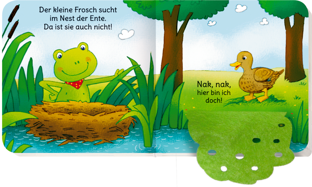 Frosch und Ente spielen Verstecken. Wo hat sich die Ente nur versteckt? Kuschelweiche, bunte Filzklappen machen die Suche zu einem Spaß für kleine Hände.