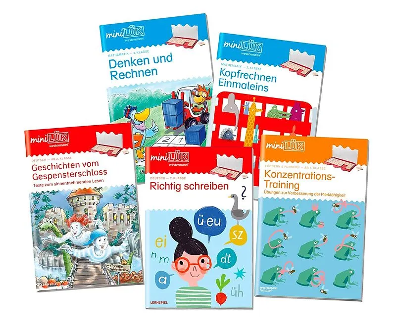 Lesen, Rechnen, Denken das Komplettpaket für Klasse 2 Mit diesem Paket meistern Kinder spielerisch und strukturiert die wichtigsten Lerninhalte der zweiten Klasse. Die fünf enthaltenen Hefte fördern gezielt Kompetenzen in Sprache, Mathematik und Konzentration...