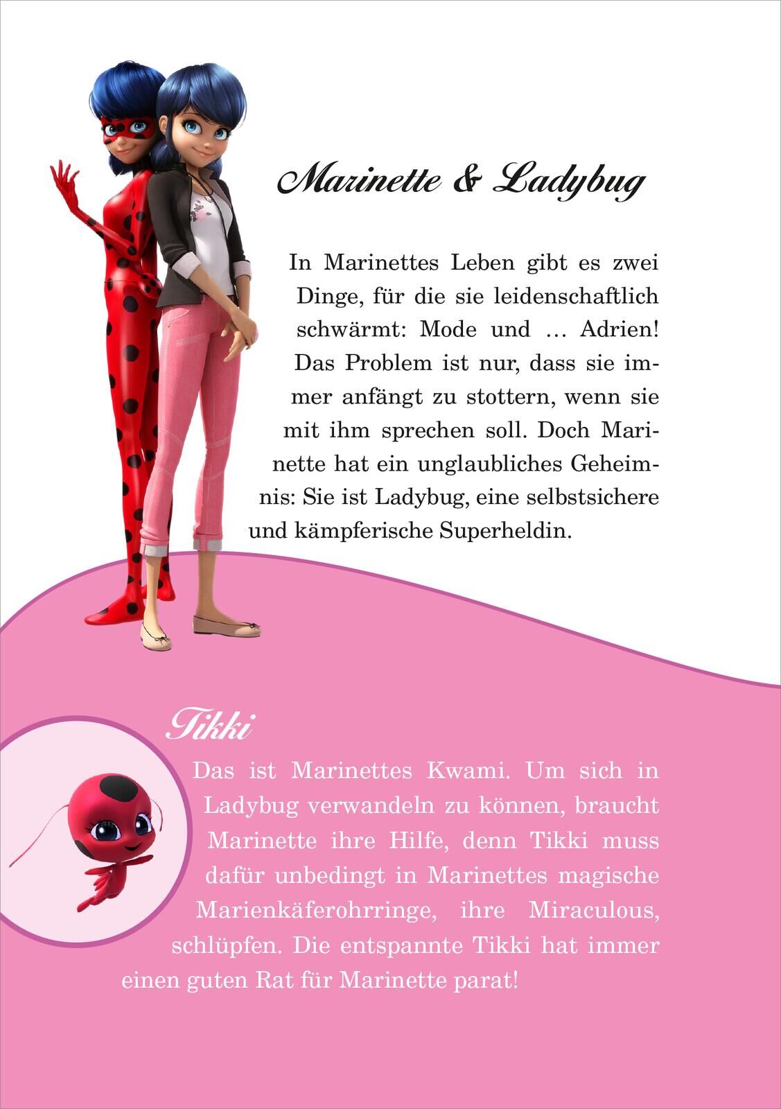 Eigentlich heißt sie ja Marinette und ist eine ganz normale Schülerin. Aber bei Gefahr verwandelt sich Marinette im Nu in die maskierte Superheldin Ladybug. Etwa wenn der Superschurke Hawk Moth wieder seine dunklen Gehilfen losschickt, um die Miraculous zu rauben, die mächtigsten Gegenstände der Welt. Zusammen mit Cat Noir sorgt Ladybug dafür, dass das Böse vertrieben wird. Stets dabei sind der kleine Kwami Tikki und ihr magisches Jo-Jo.