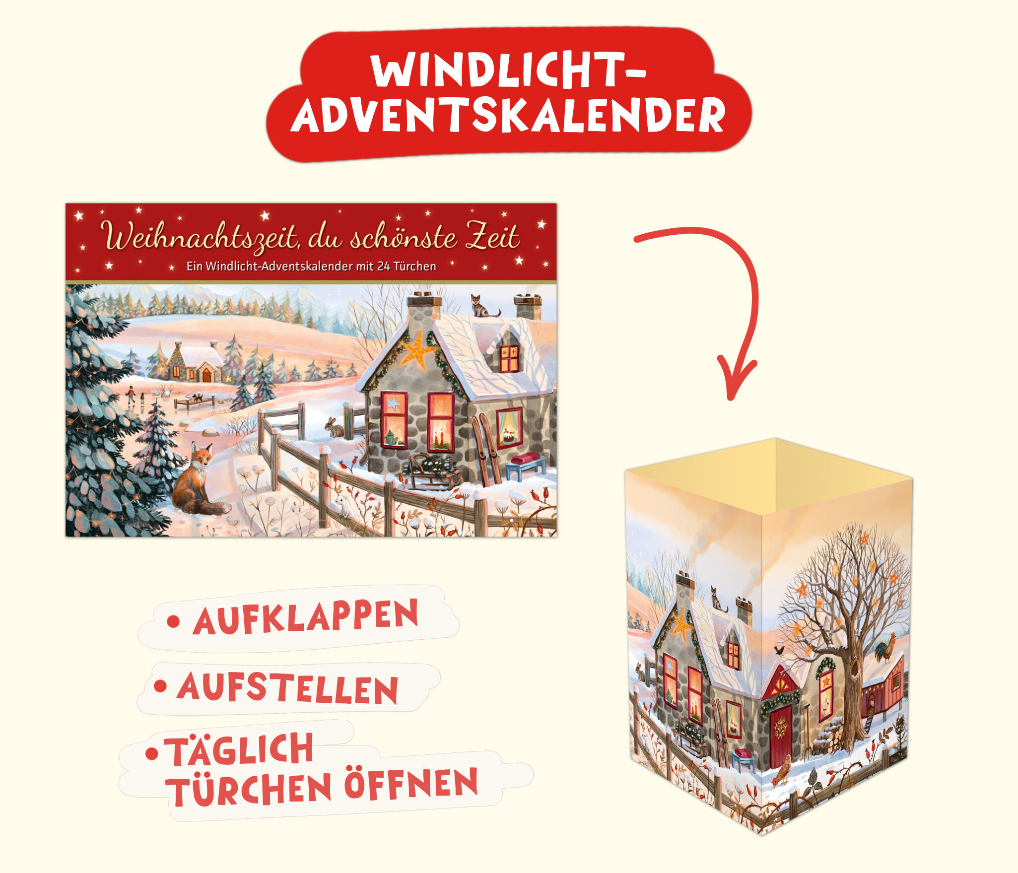 Ein Adventskalender-Windlicht zum Aufstellen und Genießen: Jeden Tag im Advent ein Türchen öffnen und neue weihnachtliche Details im winterlichen Landhaus entdecken. Mit stimmungsvoller Illustration, Glitzer und Kerzenschein wird dieser Adventskalender zu eine...