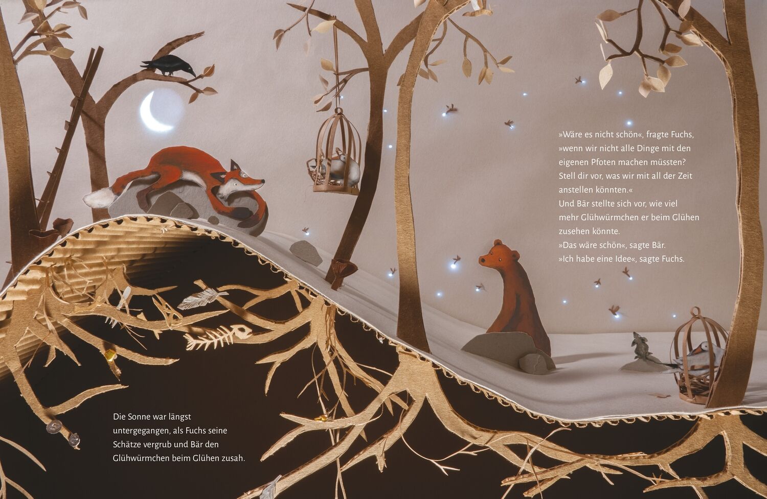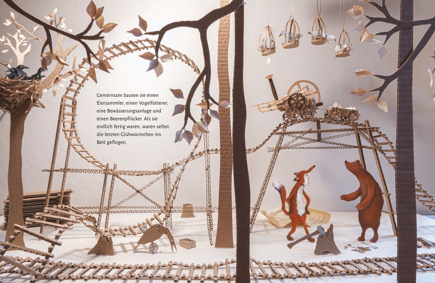 Glücklich und zufrieden leben Fuchs und Bär im Wald. Doch Fuchs ist rastlos: Könnten sie nicht noch glücklicher sein, wenn sie weniger jagen und sammeln, wenn sie nicht alles mit den eigenen Pfoten machen müssten? Eifrig schmieden Fuchs und Bär Pläne, pflanze...