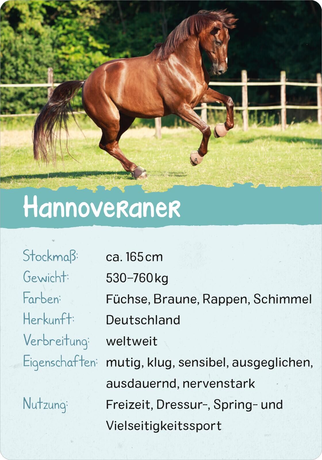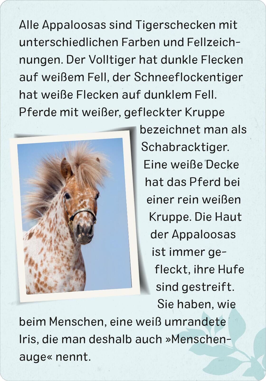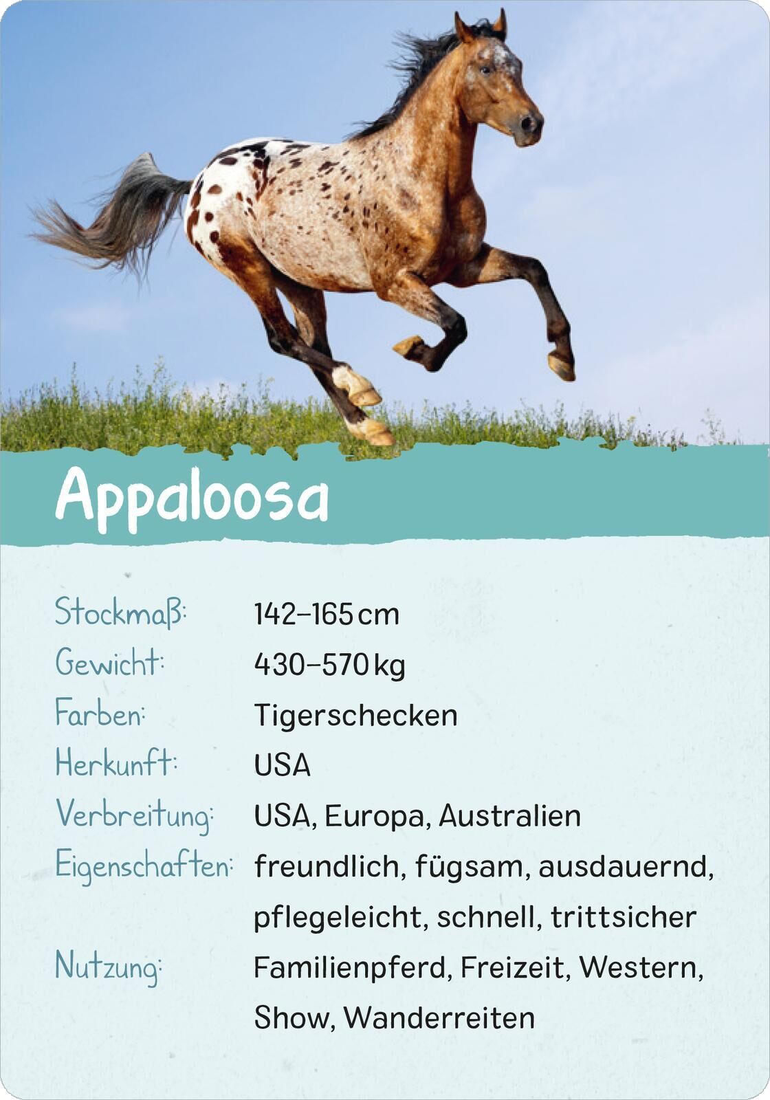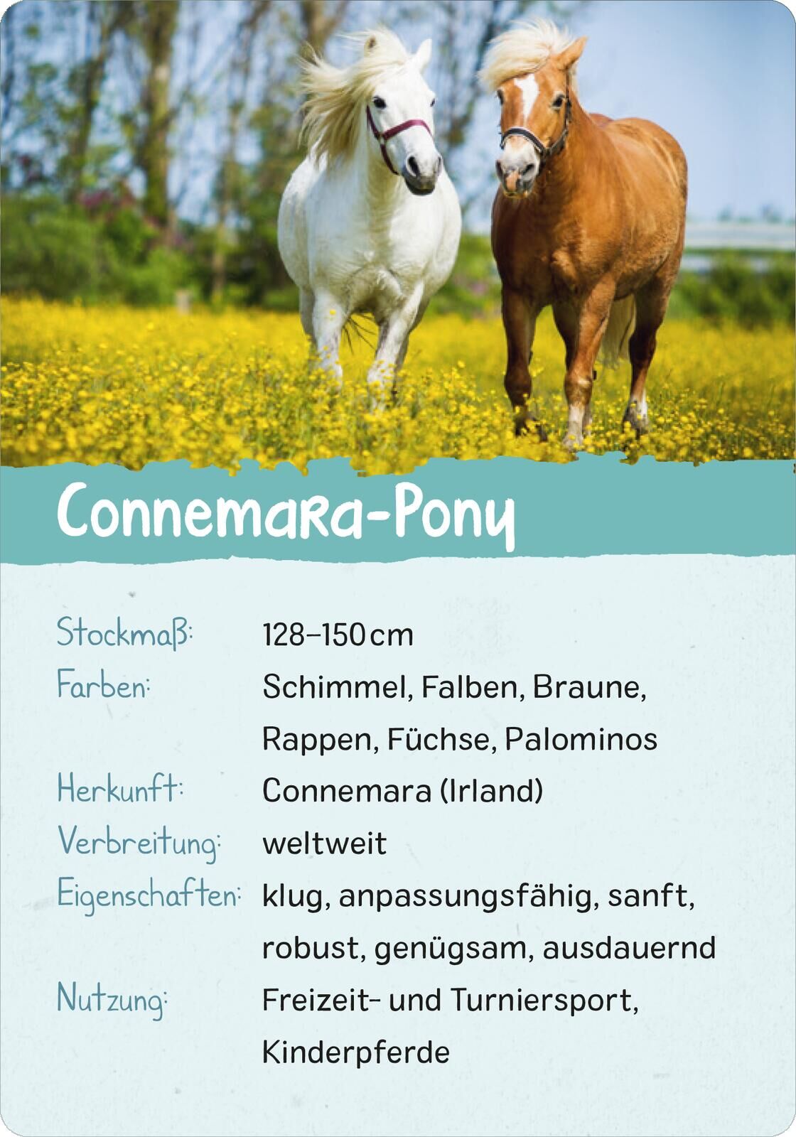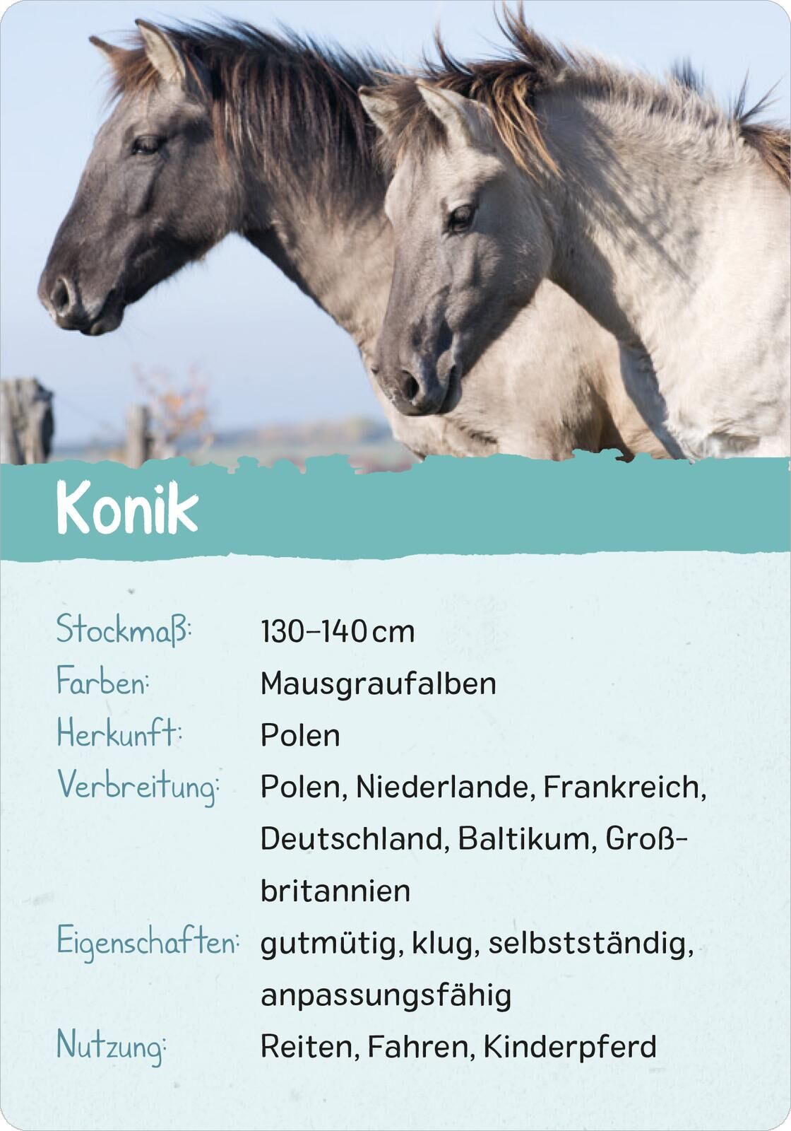 Entdecke alles rund um Pferde und Ponys Die Naturforscher-Box beinhaltet 50 Karten. Auf jeder Karte wird eine Pferderasse vorgestellt mit Foto, Steckbrief und zusätzlichen interessanten Informationen, wie z. B. Aussehen, Fähigkeiten, Geschichte oder Nutzung. ...