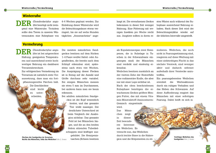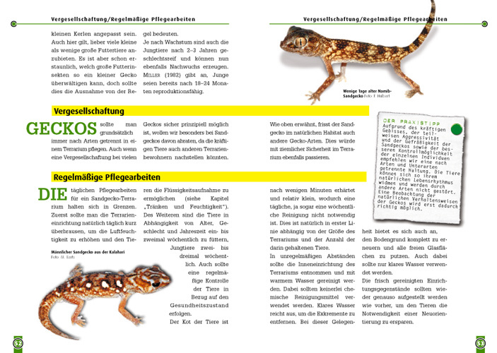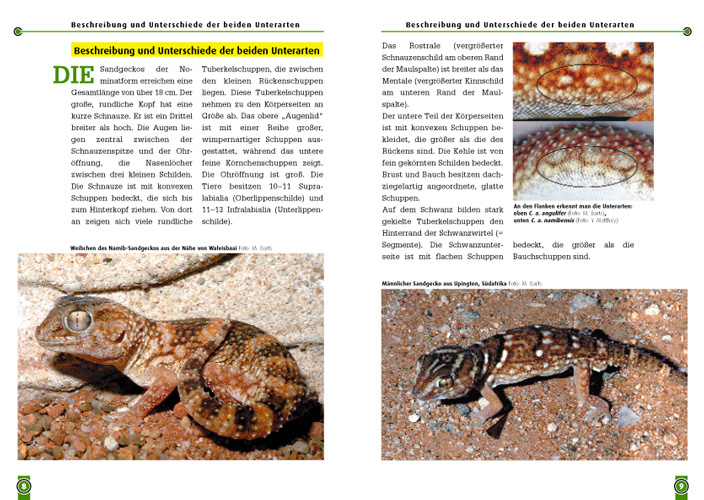 Sandgeckos sind kräftige, am Boden lebende Tiere. Ihre imposante Statur, ihr außergewöhnliches Verhalten und ihre äußerst ansprechende Färbung haben sie zu beliebten Terrarientieren gemacht. Nur wenige Zuchtgruppen befinden sich in privaten Terrarienanlagen. D...