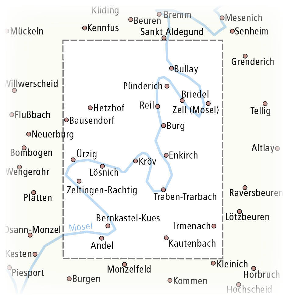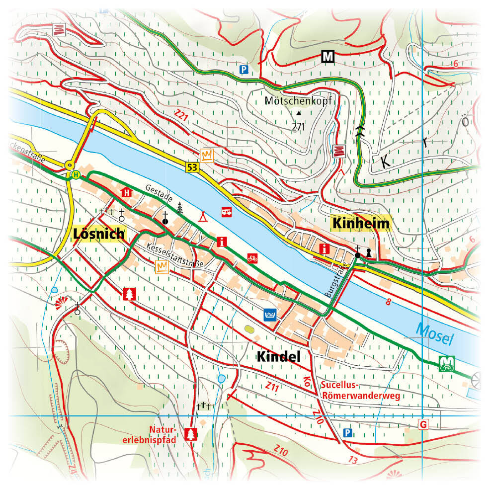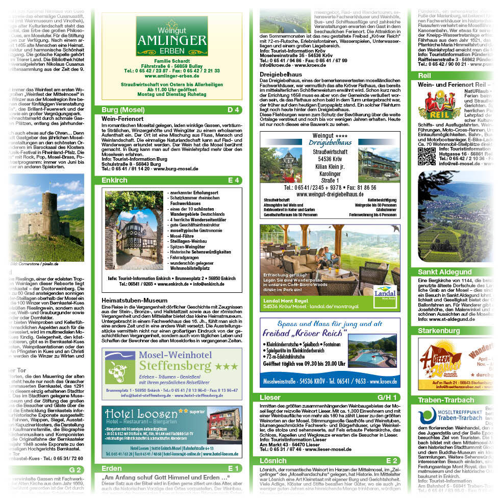Das Gebiet der Mittelmosel ist Thema der Rad- und Wanderkarte. Auf der Karte sind nicht nur Rad- und Wanderwege entlang des Moselufers eingezeichnet, sondern auch Höhenwege in den angrenzenden Weinbergen, die mit markierten Aussichtspunkten die steilen Wegstre...
