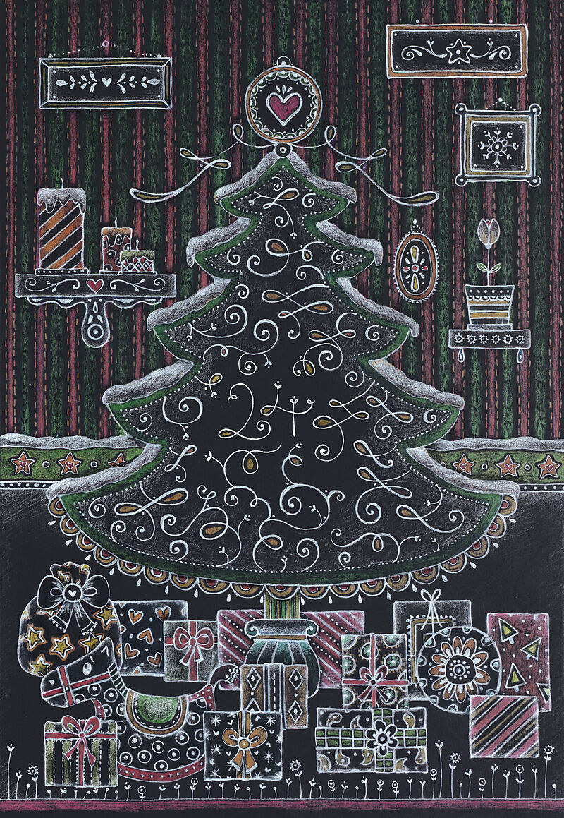 Bild-Adventskalender im Großformat Motiv beidseitig, Vorderseite goldfolienveredelt Dieser Bild-Adventskalender wurde von der Künstlerin Mo Büdinger liebevoll im angesagten Tafel-Kreide-Look gestaltet. Die Motive hinter den 24 Türchen fügen sich in das Gesamtb...