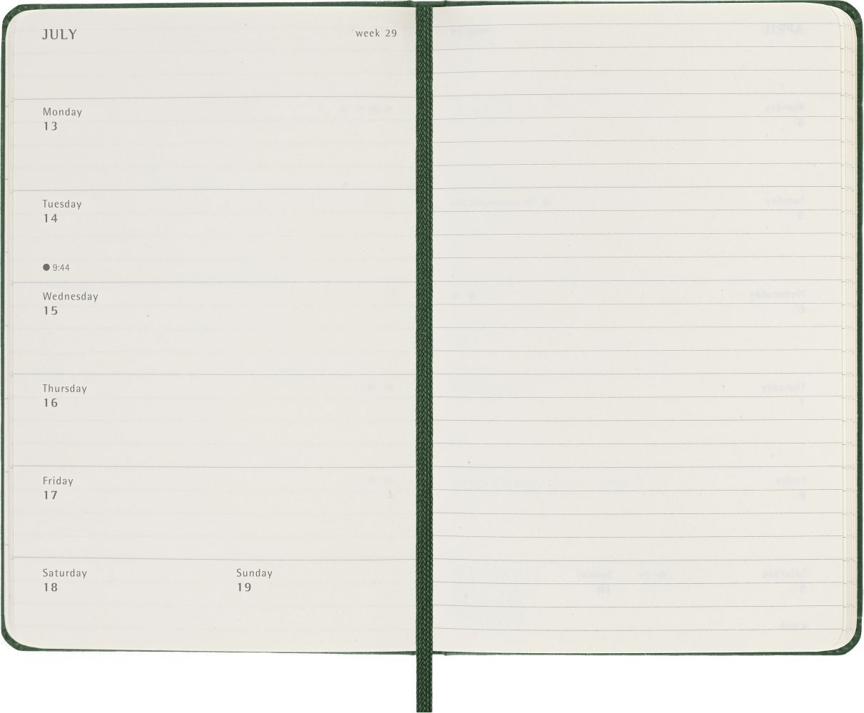 Wochen-Notizkalender Classic Der Moleskine Wochenkalender reicht von Januar bis Dezember. Mit den Wochenterminen auf der linken Seite und einer linierten rechten Seite mit Platz für Notizen und Ideen ist dieses beliebte Kalenderformat perfekt für Lernende, Le...
