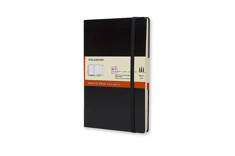 The Moleskine Large Japanese Album is bound in cardboard, with a Moleskine cover having rounded corners and an elastic enclosure. There are 48 accordion-style zigzag acid-free pages, and the notebook includes an expandable inner note holder made of cardboard a...