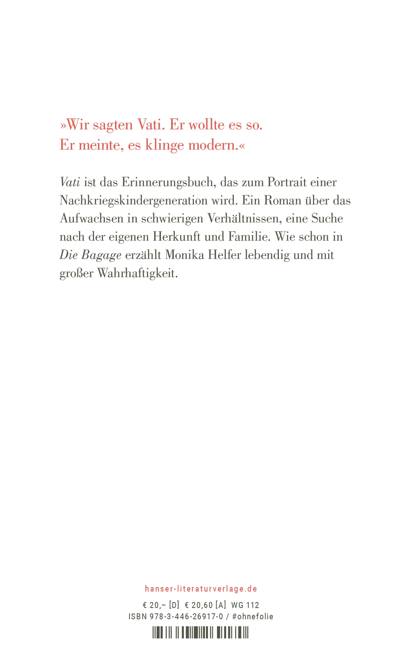 Helfer lädt mit dieser sinnlichen und stimmig-bruchstückhaften Montage aus Erinnerungen und Reflexionen, Vergangenheit und Gegenwart zum echten Eintauchen ein. Paula Pfoser, ORF Sommerbuchempfehlungen, 15.06.21 Das Buch berührt tief und weckt Verständnis für eine Generation, die oftmals unverstanden geblieben ist. Damit füllt Vati' auf empathische und sehr kluge Weise eine Leerstelle. Barbara Geschwinde, WDR5 Bücher, 20.03.21 "Ein letzter anrührender Liebesdienst. ... Helfers unaufgeregtes, unprätentiöses, von Austriazismen geerdetes Plauderparlando ist ein absolut äquates Medium für diese wechselvolle Lebensgeschichte." Frank Schäfer, taz am Wochenende, 13.03.21 Ein ganz warmer Erzählton Das hat eine ganz eigene Kraft. Annemarie Stoltenberg, NDR Kultur, 02.03.21 Kurz, lapidar, ein bisschen sprunghaft, aber immer wieder nah an diesem Versuch, den Vater zu verstehen. Diese Aufrichtigkeit hat etwas hoch Charmantes. Rainer Moritz, NDR Kultur, 02.03.21 "Dieses Sammelsurium eines selten leichten Lebens erzählt Helfer in einer glasklaren Sprache, die subkutanen Witz, Esprit und Lebensweisheit birgt. ... Ach, man könnte ein ganzes Buch lang von diesem Buch schwärmen. So viel Wärme, Ehrlichkeit und Schwere war selten." Peer Teuwsen, NZZ am Sonntag, 28.02.21 "Man reist in diesem schmalen Roman lesend durch all das, wozu man sonst viele Bücher braucht. Durch die Sehnsucht zur Sentimentalität, auf die schrille Heiterkeit und tiefe Traurigkeit folgt. Man lernt aus der Lektüre, dass die Verzerrungen und Verschiebungen des Alltäglichen vielleicht das Geheimnis des Erinnerns sind und dass die Weigerung, sich allein an Tatsachen festzuhalten, die Eleganz von Monika Helfers Erzählen ausmacht." Wolfgang Paterno, Profil, 24.01.21 "Fraglos gehört Monika Helfers Familienroman zu den berührendsten und bewegendsten Publikationen dieser literarischen Saison. Er fasziniert sowohl sprachlich als auch in punkto Stoffwahl. Die Verfasserin sollte dafür endlich mit dem Deutschen Buchpreis geehrt werden, der ihr 2017 entging." Ulf Heise, MDR Kultur, Februar 2021 "Helfers Tonfall ist unsentimental, ohne Gejammer und Anklage, kurz: bezaubernd. Keine Bitterkeit wird verschwiegen, nichts geschönt, aber auch nichts über Gebühr ausgemalt oder zu Tode analysiert. Das Ganze liest sich leicht, gelingt selten so wie hier und wärmt das Herz." Gisela Trahms, Welt, 20.02.21 "So viel Tod, aber auch so viel Leben - wer Monika Helfers Bücher liest, begegnet dem Erdendasein in seiner ganzen Wucht, und doch steigt man aus ihren Romanen nie mit einem deprimierenden Gefühl aus." Meike Schnitzler, Brigitte, 03.02.21 "Mit 'Vati' zeigt die Autorin erneut, dass sie eine wahre Wortzauberin ist." Meike Schnitzler, Brigitte, 03.02.21 "Ein vielschichtiges Gemälde einer Familie, einer Zeit und einer Generation. ... Es sind knappe Sätze, die sich dem Vater, seiner Schweigsamkeit und seinem Fehlen annähern. Fragen bleiben offen und geben den Blick frei in Abgründe. Eine Fortsetzung der Helfer'schen Familiengeschichte ist erfreulicherweise schon in Planung." Stefanie Panzenböck, Falter, 03.02.21 Mit Vati' schreibt Monika Helfer ihre Saga fort, die mit dem Roman Die Bagage' begonnen hat: als eine behutsam eindringliche Wiederherstellung ihrer eigenen Herkunft. Rose-Maria Gropp, Frankfurter Allgemeine Zeitung, 28.01.21 "'Vati' ist kein Buch, das Wahrheiten verkündet, sondern eines, das nach den Zwischentönen und Schicksalspunkten von Biografien sucht. Das gelingt Monika Helfer darum so gut, weil sie Sensibilität mit Diskretion verbindet." Christoph Schröder, Zeit Online, 26.01.21 "Wie schon 'Die Bagage' ist auch 'Vati' keine voyeuristische Nabelschau, sondern gelungene Literatur, in der das Schreiben, das auf Erinnerung setzt, immer auch kritisch beäugt wird." Carsten Otte, SWR2 Lesenswert Magazin, 24.01.21 Was die Meisterin der Kürze schafft, ist bewunderungswürdig: das angefochtene Leben eines Menschen so verschwommen schön und kristallklar aufzumalen, dass man alles sieht und nichts davon nachzeichnen könnte, das Taumeln zwischen Himmel und Hölle, das Taumeln auf der Erde. Alexander Solloch, NDR Kultur, 24.01.21 "Ein so bedrückendes wie berührendes Erinnerungsbuch. ... Die Autorin ist eine äußerst versierte Dramaturgin ihres biografischen Materials, das zwar von guten und schrecklichen Erlebnissen, von lustigen und aberwitzigen Familiengeschichten lebt, vor allem aber von der literarischen Kunst, die Geschichte eines Menschen angemessen zu verdichten." Carsten Otte, Tagesspiegel, 24.01.21 "172 Seiten Zartheit und Liebe. Man kann das neue Buch der österreichischen Schriftstellerin Monika Helfer als Ergänzung zu ihrem jüngsten Bestseller, 'Die Bagage', lesen und doch steht es in seiner ganzen Lakonie und Schönheit allein wie ein monolithischer Fels in Helfers Heimat Vorarlberg." Cathrin Kahlweit, Süddeutsche Zeitung, 26.01.21