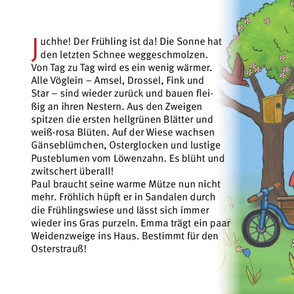 Emma und Paul können den Frühling kaum erwarten. Sie beobachten die Blumen im Garten, färben Eier, backen ein Osterlämmchen und freuen sich auf das Osterfest. Emma und Paul erleben das Erwachen des Frühlings und erwarten gespannt das Osterfest. Sie färben Eier...