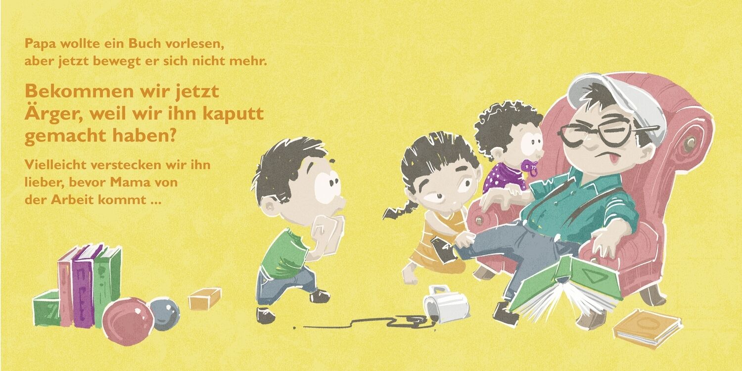 Papa, bist du müde? Papa will vorlesen aber jetzt bewegt er sich nicht mehr. Für die Kinder ist klar: Papa ist kaputt! Also müssen sie ihn irgendwie verstecken, bevor Mama heimkommt. Ob im Blumentopf oder unter der Stehlampe alle Verstecke werden ausprobiert....