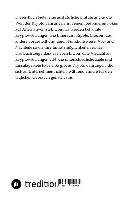 Dieses Buch bietet eine ausführliche Einführung in die Welt der Kryptowährungen, mit einem besonderen Fokus auf Alternativen zu Bitcoin. Es werden bekannte Kryptowährungen wie Ethereum, Ripple, Litecoin und andere vorgestellt und deren Funktionsweise, Vor- und...
