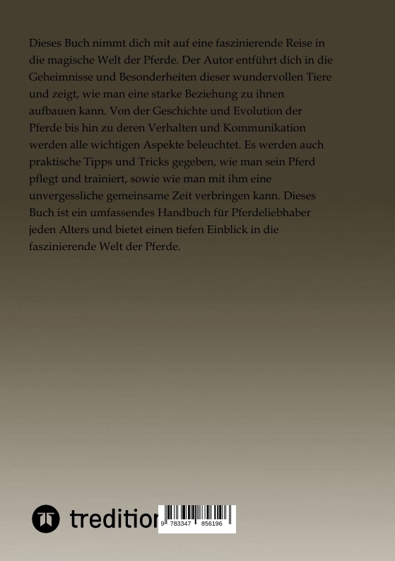 Dieses Buch nimmt dich mit auf eine faszinierende Reise in die magische Welt der Pferde. Der Autor entführt dich in die Geheimnisse und Besonderheiten dieser wundervollen Tiere und zeigt, wie man eine starke Beziehung zu ihnen aufbauen kann. Von der Geschichte...