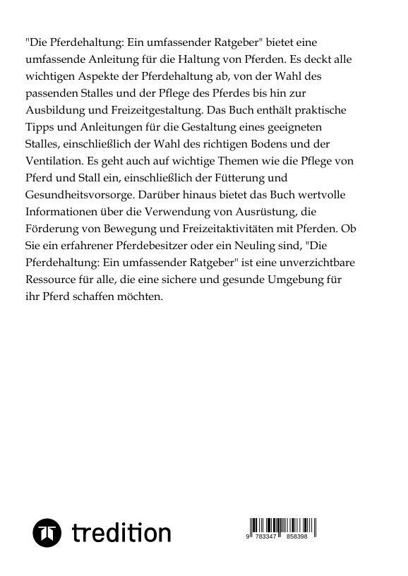 "Die Pferdehaltung: Ein umfassender Ratgeber" bietet eine umfassende Anleitung für die Haltung von Pferden. Es deckt alle wichtigen Aspekte der Pferdehaltung ab, von der Wahl des passenden Stalles und der Pflege des Pferdes bis hin zur Ausbildung und Freizeitg...