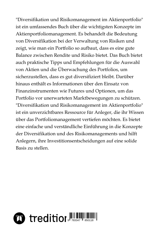 "Diversifikation und Risikomanagement im Aktienportfolio" ist ein umfassendes Buch über die wichtigsten Konzepte im Aktienportfoliomanagement. Es behandelt die Bedeutung von Diversifikation bei der Verwaltung von Risiken und zeigt, wie man ein Portfolio so auf...