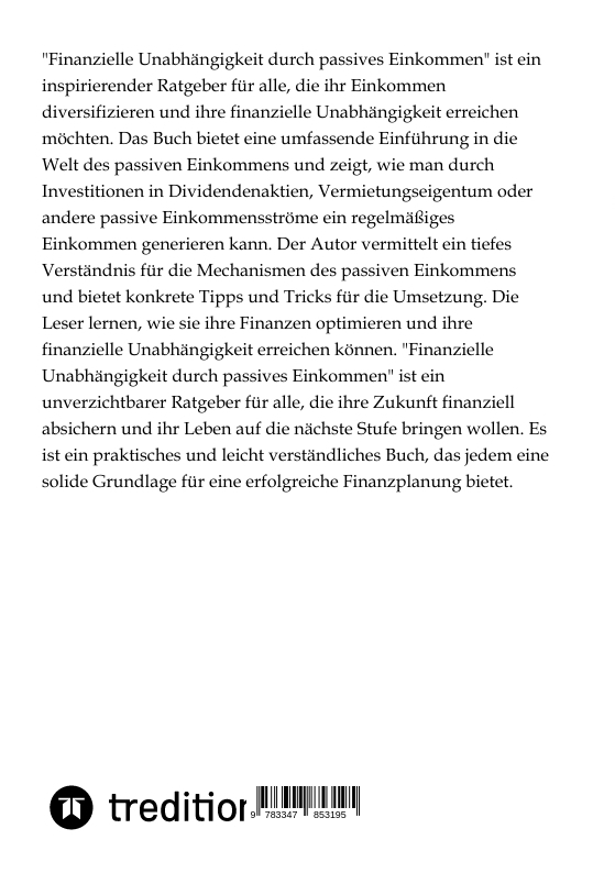 "Finanzielle Unabhängigkeit durch passives Einkommen" ist ein inspirierender Ratgeber für alle, die ihr Einkommen diversifizieren und ihre finanzielle Unabhängigkeit erreichen möchten. Das Buch bietet eine umfassende Einführung in die Welt des passiven Einkomm...