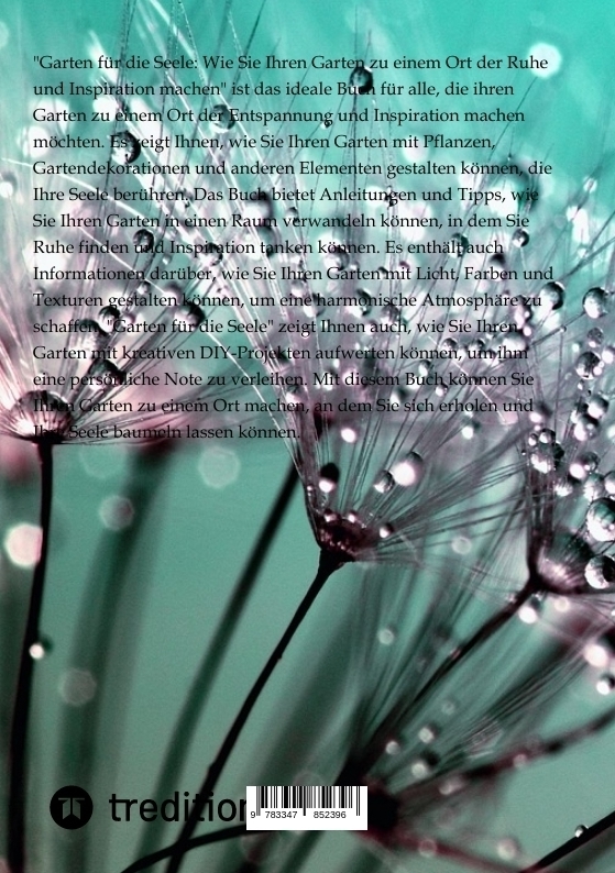 "Garten für die Seele: Wie Sie Ihren Garten zu einem Ort der Ruhe und Inspiration machen" ist das ideale Buch für alle, die ihren Garten zu einem Ort der Entspannung und Inspiration machen möchten. Es zeigt Ihnen, wie Sie Ihren Garten mit Pflanzen, Gartendekor...