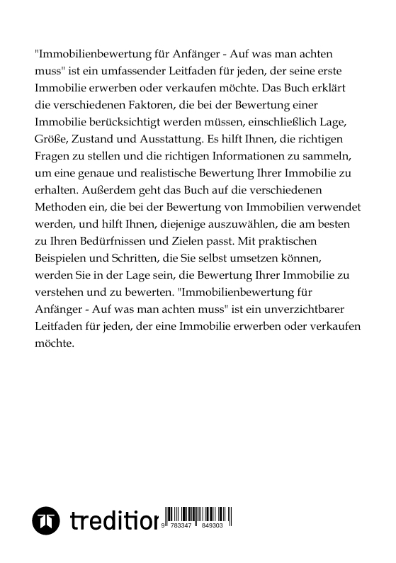 "Immobilienbewertung für Anfänger - Auf was man achten muss" ist ein umfassender Leitfaden für jeden, der seine erste Immobilie erwerben oder verkaufen möchte. Das Buch erklärt die verschiedenen Faktoren, die bei der Bewertung einer Immobilie berücksichtigt we...