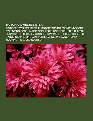 Quelle: Wikipedia. Seiten: 102. Kapitel: Liste der Weltmeister im Motorradstraßenrennsport, Valentino Rossi, Max Biaggi, Loris Capirossi, Eric Oliver, John Surtees, Casey Stoner, Toni Mang, Egbert Streuer, Tarquinio Provini, Dani Pedrosa, Nicky Hayden, Gary Ho...