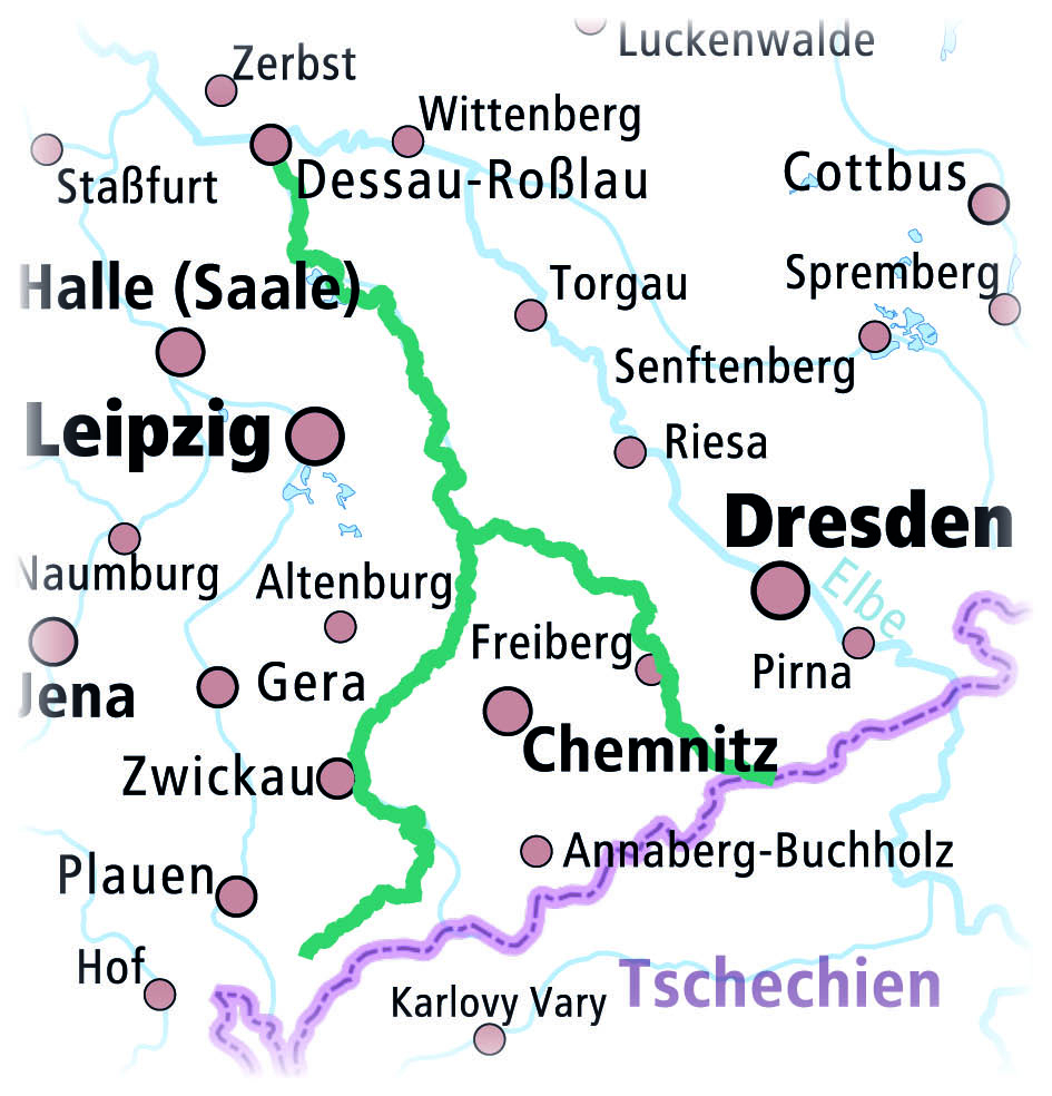 Der erste Teil der dreigeteilten Strecke des Mulderadwegs entlang der Zwickauer Mulde startet an der Quelle im Naturpark Erzgebirge Vogtland. Zahlreiche Schlösser und Burgen, dichte Wälder und Auen prägen das Landschaftsbild. Auch auf der kürzeren Alternativst...