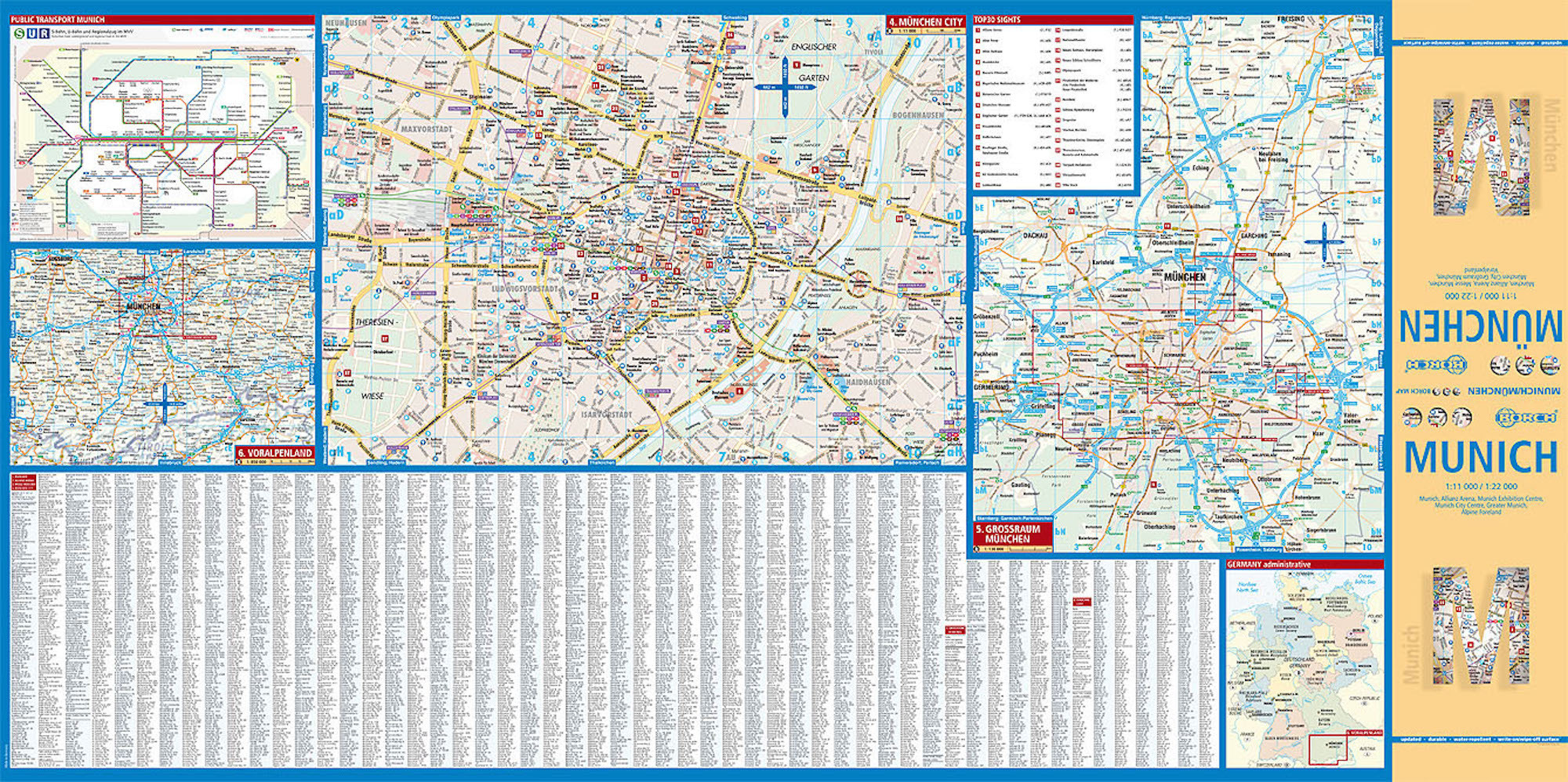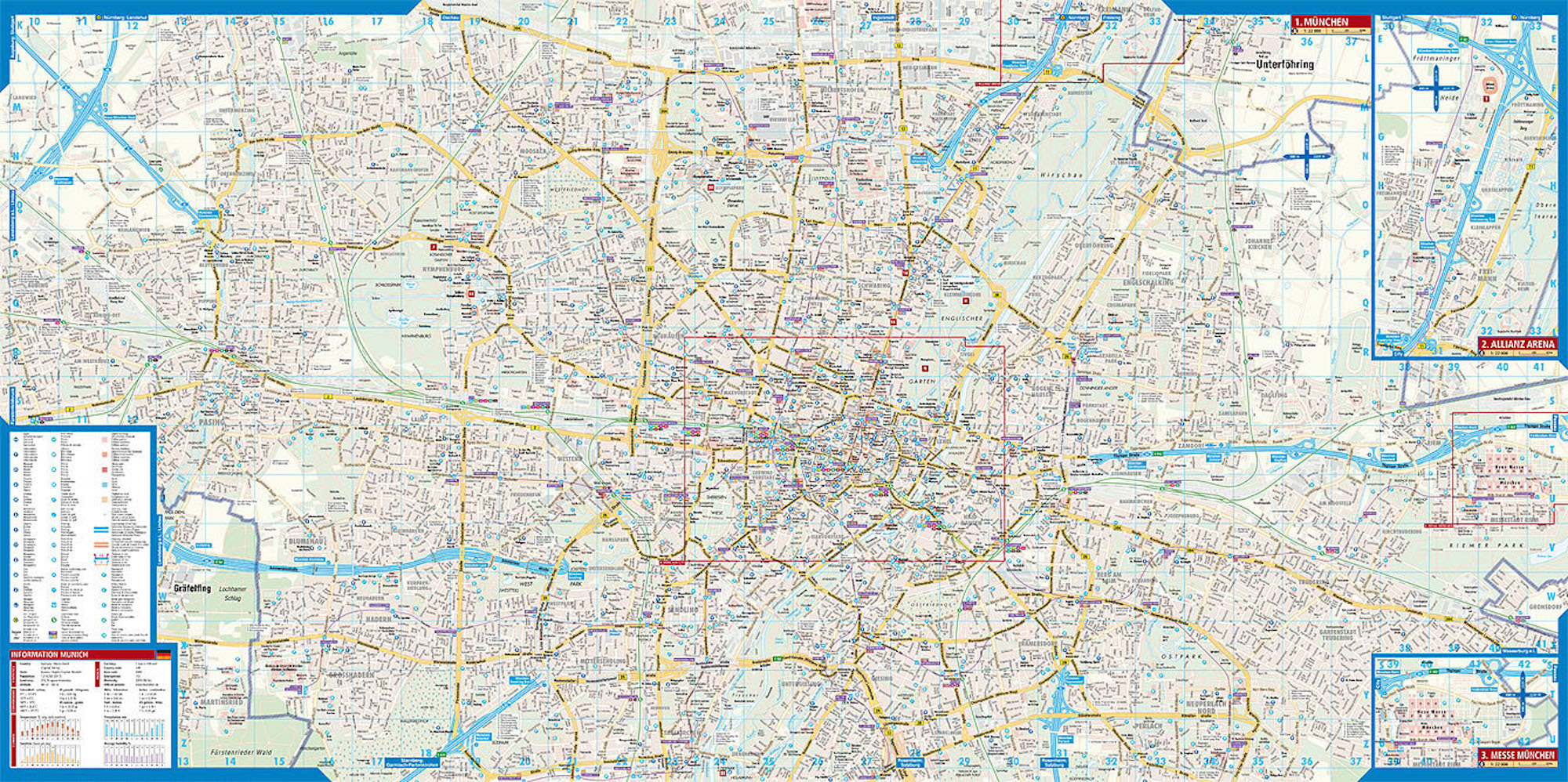 München Innenstadt 1:11 000, München 1:22 000, München Großraum 1:130 000, die Messe München 1:22 000, die Allianz Arena 1:22 000, das Voralpenland 1:850 000, eine Nahverkehrskarte des Münchener Verkehrsverbunds, die 30 Top Sehenswürdigkeiten Münchens, eine ad...
