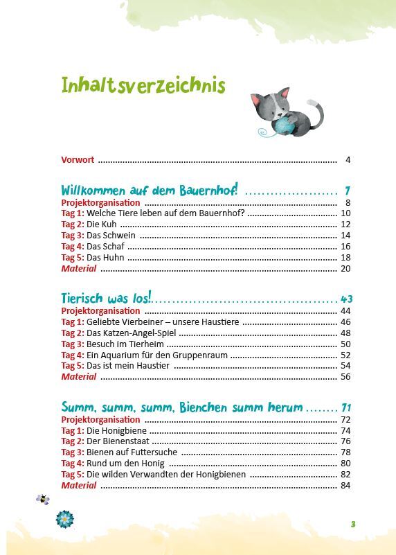 In drei ganzheitlichen und ereignisreichen Wochenprojekten begegnen die Kinder den beliebtesten Haus- und Bauernhoftieren und den fleißigen Honigbienen. Gemeinsam unternehmen Sie Ausflüge zum Bauernhof und ins Tierheim, basteln ein Tierlexikon und erfahren spi...