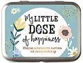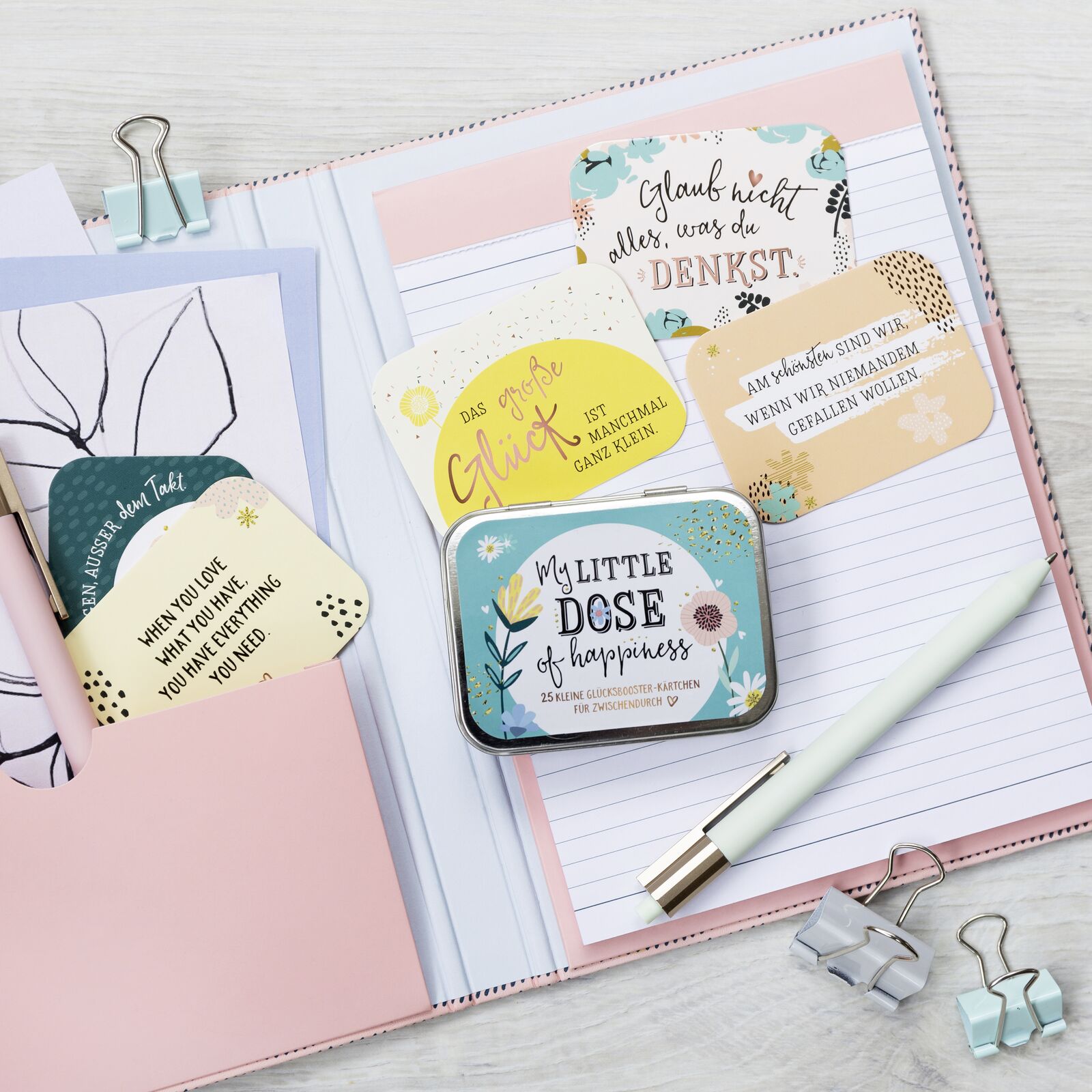 Glück to go 25 Glückssprüche in einer kleinen Box Entdecke das kleine Glück to go für deine Handtasche: In der praktischen Metalldose My little dose of happiness findest du 25 Affirmationskärtchen mit motivierenden und positiven Sprüchen zum Thema Glück. Die ...