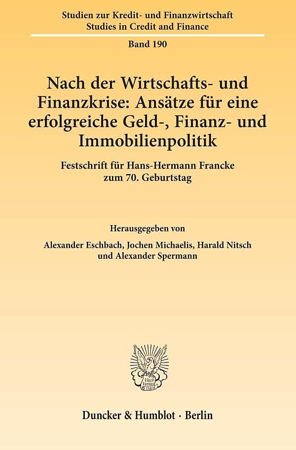 Die Wirtschafts- und Finanzkrise hat uns gezeigt, wie vielfältig die Wechselwirkungen zwischen Geld-, Finanz- und Immobilienpolitik aussehen. In insgesamt 19 Beiträgen, untergliedert in die Bereiche Monetäre Ökonomie, Finanzwissenschaft und Immobilienökonomie,...Die Wirtschafts- und Finanzkrise hat uns gezeigt, wie vielfältig die Wechselwirkungen zwischen Geld-, Finanz- und Immobilienpolitik aussehen. In insgesamt 19 Beiträgen, untergliedert in die Bereiche Monetäre Ökonomie, Finanzwissenschaft und Immobilienökonomie, thematisieren Freunde, Schüler und Kollegen von Hans-Hermann Francke diese Interdependenzen. Ziel aller Beiträge ist es, Ansatzpunkte für eine sachgerecht ausgestaltete Wirtschaftspolitik zu identifizieren.