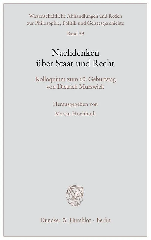 Inhalt: M. Hochhuth, Nüchtern und klar trotz Postmoderne. Drei wissenschaftstheoretische Fragen zu Dietrich Murswieks Sechzigstem - H. Wilms, Persönlichkeitsschutz im Zeitalter des Internet - K. Seelmann, Hegel und der Staat als Vertrag - C. Hillgruber, Deutschland in Europa; die grundgesetzliche Konzeption deutscher Staatlichkeit - R. Wahl, Verfassung jenseits des Staates. Eine Zwischenbilanz - J. Kersten, Parlamentskunst. Über das Verhältnis von demokratischer und symbolischer Repräsentation - H. Schiedermair, Die Menschenwürde als oberstes Konstitutionsprinzip in der Ordnung des Grundgesetzes - G. Lübbe-Wolff, Der Grundrechtsschutz nach der Europäischen Menschenrechtskonvention bei konfligierenden Individualrechten. Plädoyer für eine Korridor-Lösung - D. Dörr, Die indigenen Völker Nordamerikas und das Selbstbestimmungsrecht