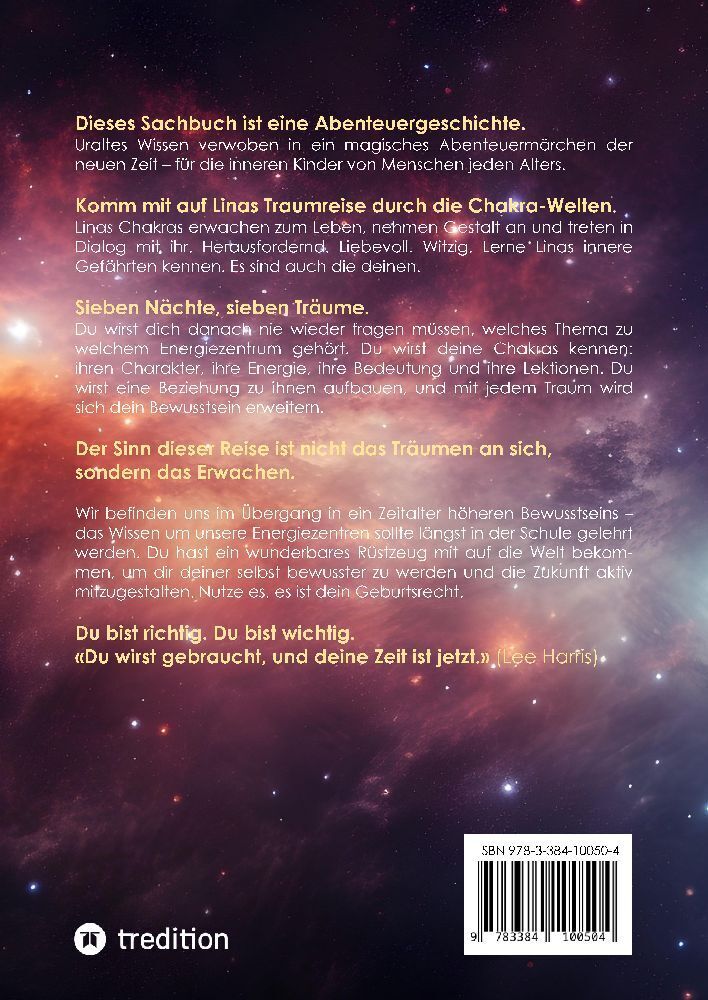 Chakra-Bücher gibt es wie Sand am Meer. Doch keines ist wie dieses. Dieses Sachbuch verwebt uraltes Wissen in ein magisches Abenteuermärchen der neuen Zeit - für die inneren Kinder von Menschen jeden Alters. Linas Chakras erwachen zum Leben, nehmen Gestalt an ...