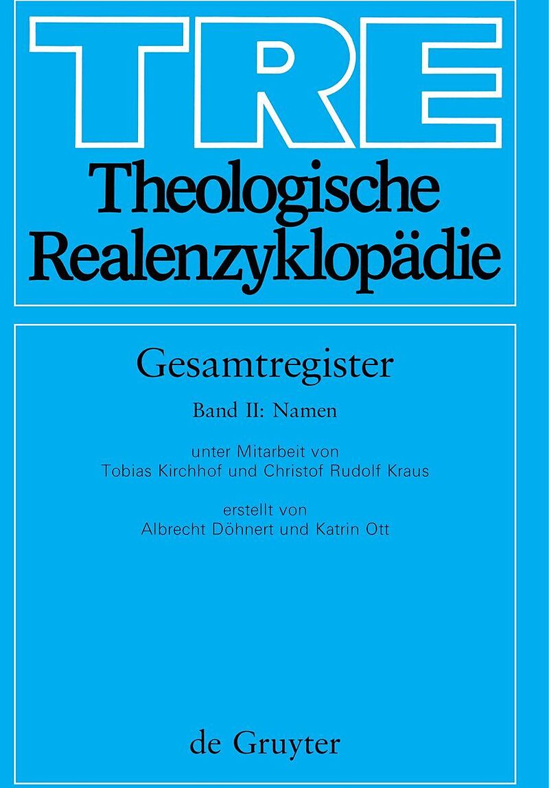After the completion of the Theologische Realenzyklopädie in 2004, a newly compiled index will give access to the whole work. Volume 1 of the complete index (published in 2006) gives a complete listing of all place references, subjects, and bible quotations. ...