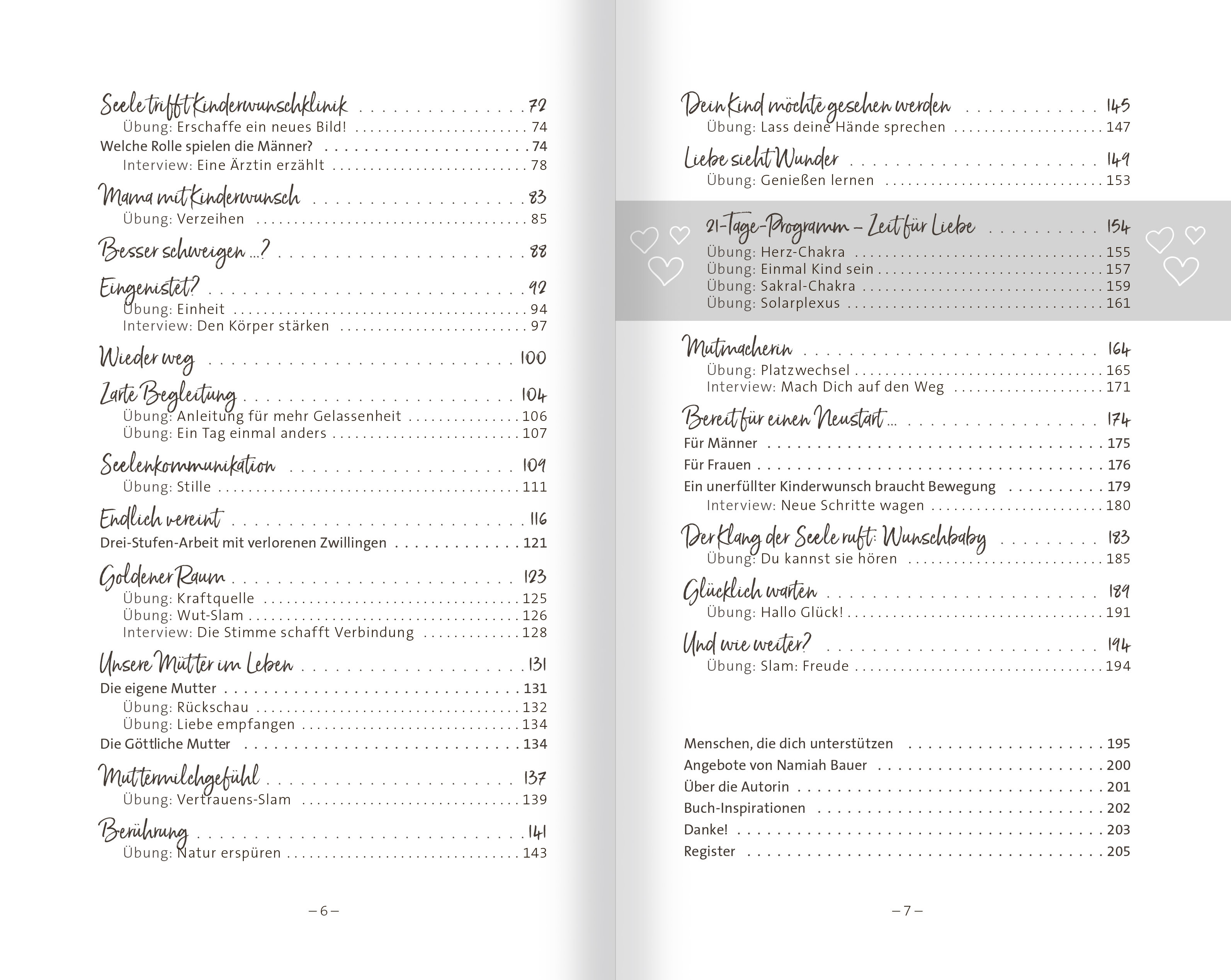 Namiah Bauer, 1966 in Köln geboren, machte einst Karriere in der Modebranche und führte ein Leben auf der Überholspur. Doch sie war nicht glücklich. Erst mit ihren beiden Kindern zogen Ruhe und Glück in ihr Leben ein. Gleichzeitig erlebte sie tiefe Trauer, als sich der Wunsch nach einem dritten Kind nicht erfüllte. Ihr Weg zum Wunschkind wurde zur Passion: Heute arbeitet sie mit Hingabe als Kinderwunschberaterin und hilft Frauen dabei, dass die Sehnsucht nach einem Kind nicht länger unerfüllt bleibt. Namiah Bauer lebt mit ihrer Familie in der Nähe von Aachen auf einem Hof mitten in der Natur, wo auch ihre Kinderwunschseminare und Ausbildungen stattfinden.