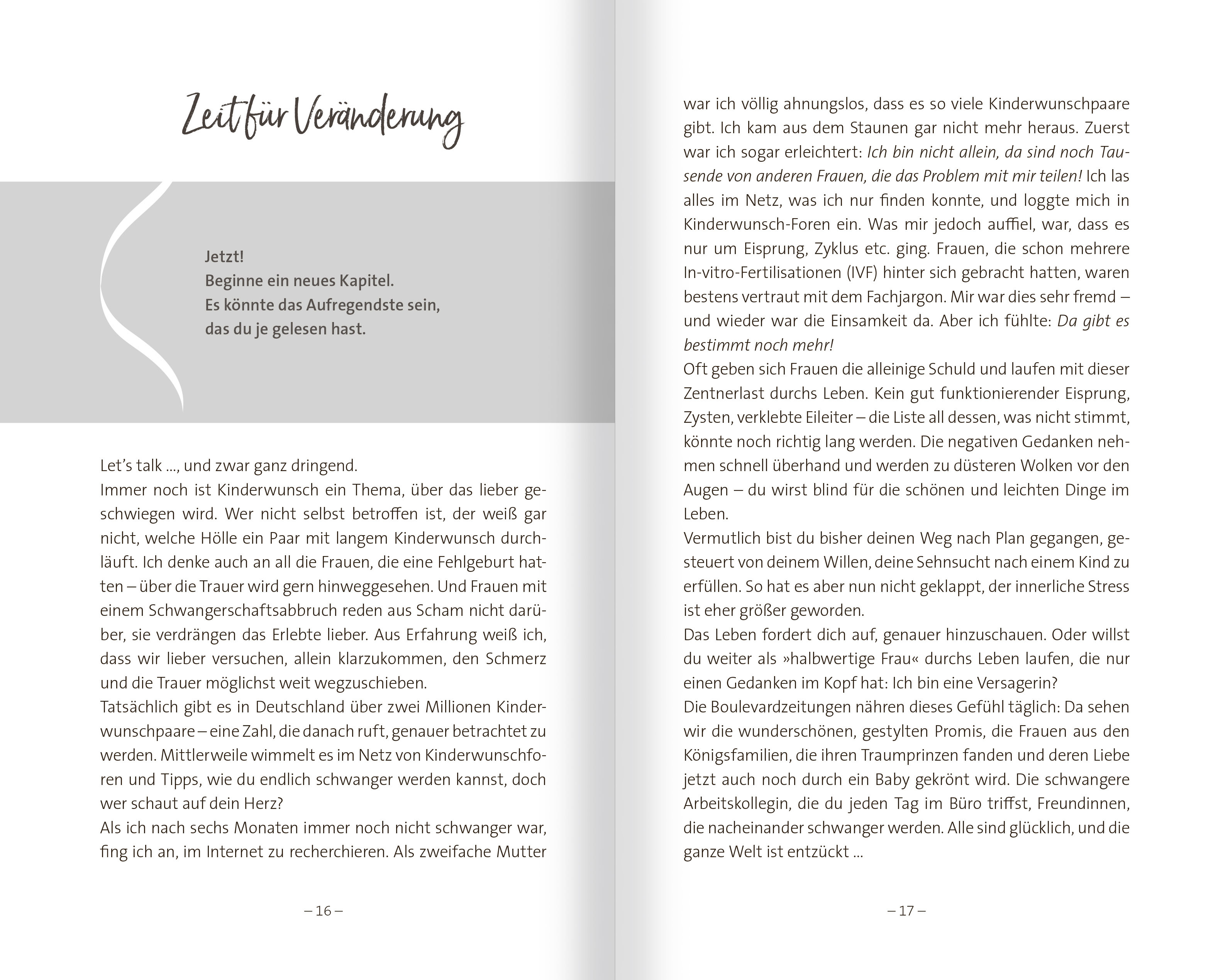 ((Auszug)) Eingenistet? JA. Nein. Ja! Ich weiß nicht ... In der Teenie-Zeit haben wir die Blätter der Gänseblümchen gezählt: Er liebt mich, er liebt mich nicht In meiner Kinderwunschzeit habe ich es ähnlich gemacht: "Ich bin schwanger, ich bin's nicht " 24 Stunden am Tag schwirrte die Ja-Nein-Frage in meinem Kopf. Jede klitzekleine Körperveränderung, ein Ziehen im Unterleib oder Spannen in der Brust deutete ich als mögliche Schwangerschaft - mein großer Herzenswunsch. Der innerliche Stress bestimmte jedoch über meinen Körper, und die enorme Anspannung war leider keine Einladung für ein Kind. In dieser Zeit absolvierte ich meine Ausbildung zur spirituellen Geburtsbegleiterin, was die Sache nicht vereinfachte. Ich wurde feinfühliger für die Seelenwelt und spürte, dass eine Seele bereit war zu kommen. Und dann war sie plötzlich da, ich spürte es sofort. Wie sich das angefühlt hat? Als ob ich nicht mehr allein war, ein klitzekleiner Funken, der mich jedoch nicht mehr in Ruhe ließ. Jeden Abend im Bett legte ich meine Hände auf den Bauch und spürte in meinen Körper. Da war etwas in mir ... so fein, fast nicht wahrzunehmen, wie eine Feder in meinem Bauch, die mich streichelte. Einige Male machte sie auf sich aufmerksam, doch von einem Tag auf den anderen kam sie nie wieder. Diese zarte Berührung kann ich noch heute fühlen, die Erinnerung ist tief gehend. Die Kinderseele blieb einfach weg, ich war untröstlich. Was hatte ich falsch gemacht? Warum wollte sie nicht bei mir bleiben? Vielleicht hast du diesen Satz schon einmal gehört: "Wenn ein Kind wieder geh…