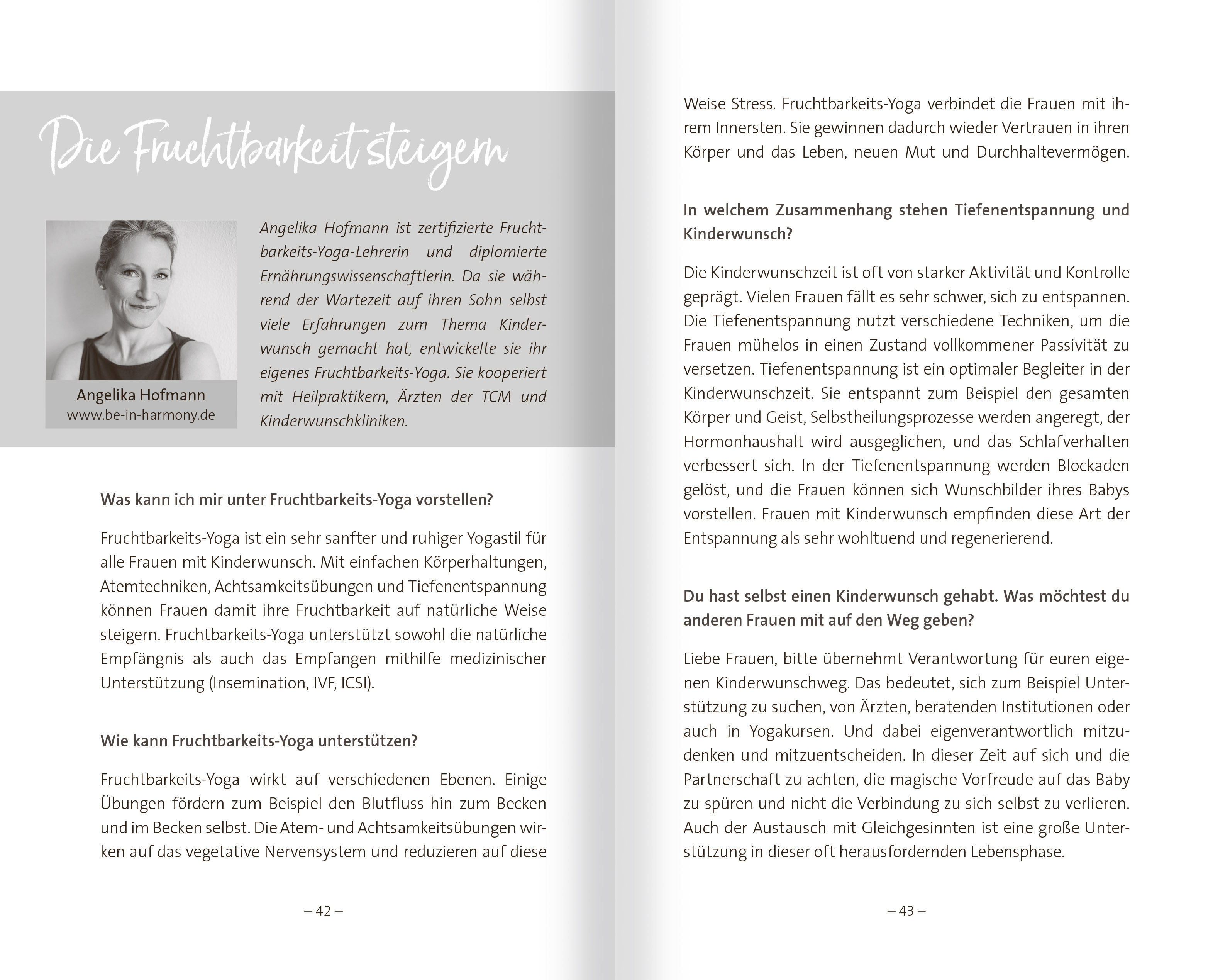 EINIGE WORTE ZUM BUCH () Es scheint ein Naturgesetz zu sein, sich nach Kindern zu sehnen und Leben weitergeben zu wollen. Wie aber diesen tiefen Wunsch erfüllen, wenn sich einfach kein Kind einstellen will? Diese Frage beantwortet das Buch, das Sie in Händen halten - aus einer heute noch eher ungewöhnlichen und meist vernachlässigten Perspektive. Das Buch von Namiah Bauer ist ein ganz besonderes, ein berührendes Buch. Ein Buch, das in unserer modernen Zeit, in der viele Menschen Perfektion vorwiegend im Außen suchen, sich das Leben immer schneller dreht und gleichzeitig immer leerer wird, einen erfreulichen Kontrapunkt setzt: Haltet inne, schaut, was euch wirklich glücklich macht, was euch im Inneren erfüllt. Es macht Freude, dieses ehrliche und erfrischend geschriebene Buch zu lesen. Durch jede Zeile schimmert Namiahs Aufrichtigkeit und ihre Liebe zu (noch) ungeborenen Kindern hindurch, ebenso wie ihre Güte und ihr unbedingter Wunsch, betroffenen "Kinderwunschfrauen und -männern" Mut zu machen. Den Mut, sich selbst und die eigenen Blockaden kennenzulernen, die feineren Ursachen zu ergründen, die der Freude und Spontaneität im Leben entgegenstehen und damit die Fruchtbarkeit einschränken können. Statt Angst und Anspannung setzen ihre Ansätze auf das Vertrauen in die göttliche Führung, auf die Lebensfreude mit all ihren Facetten, auf Dankbarkeit dem Leben gegenüber sowie auf das Zulassen des eigenen Lebensplans - mit oder ohne Wunschkind. Sie macht Mut, sich auf die ganz eigene Reise einzulassen und sich in allen Situationen mit der gewünschten Kinderseele zu verbinden, um sie auf die Erde einzuladen. Namiah schafft es in ihrem Buch, eine enge Verbindung zu ihren Leser/-innen herzustellen - mithilfe ihrer ganz eigenen Offenheit, durch die sie sie auch an ihren eigenen schmerzvollen und beglückenden Erlebnissen teilhaben lässt. Ihre vielseitigen praktischen Empfehlungen und Übungen basieren auf eigenem Erleben sowie den Erfahrungen mit zahlreichen Kinderwunschfrauen und -männern und der echten liebevollen Kompetenz, die ihr daraus erwuchs. (...) So, wie die Seele - wie so schön im Buch "Freudensprung" dargestellt - eine große Rolle spielt, ist der Körper nicht weniger wichtig. Denn Umwelttoxine und Stoffwechselendprodukte lagern sich überall im Körper ab, auch in Uterus, Eizellen und Spermien. Sie reduzieren die Empfängnisfähigkeit und sind ein wesentlicher Grund dafür, dass die Fruchtbarkeit von Frauen und Männern in den Industrienationen seit Jahrzehnten stetig abnimmt. Jedoch ganz wichtig ist auch die Psyche, die Entspanntheit und Lebensbejahung der Kinderwunschpaare. Und das ist nicht nur Wunschdenken: Eine große deutsche Studie mit werdenden Müttern, die regelmäßig transzendentale Meditation praktizierten, zeigte im Vergleich zu nicht meditierenden Müttern eine deutlich bessere seelische und gesundheitliche Verfassung während der Schwangerschaft, einen leichteren und kürzeren Geburtsverlauf, eine stabilere Gesundheit der Neugeborenen direkt nach der Geburt sowie eine längere Stilldauer im Anschluss. Ohne Weiteres können wir das auch auf die Fruchtbarkeit übertragen, denn hier spielen ebenfalls seelische Faktoren eine große Rolle. Daher: Nehmen Sie sich, liebe Leserin, lieber Leser, die vielseitigen Empfehlungen aus diesem Buch zu Herzen, finden Sie Ihren ganz persönlichen Weg in ein JA zum Leben, ein JA zu einem gesunden, entgifteten Körper, zu gesunder Ernährung, zum Verwöhnen und Genießen, ein JA zu Ihrem Lebensweg, sodass sich - mit oder ohne Kind - Ihr Leben bereichert. Dr. Karin Pirc Ärztliche Leitung der Maharishi Ayurveda Privatklinik, Bad Ems