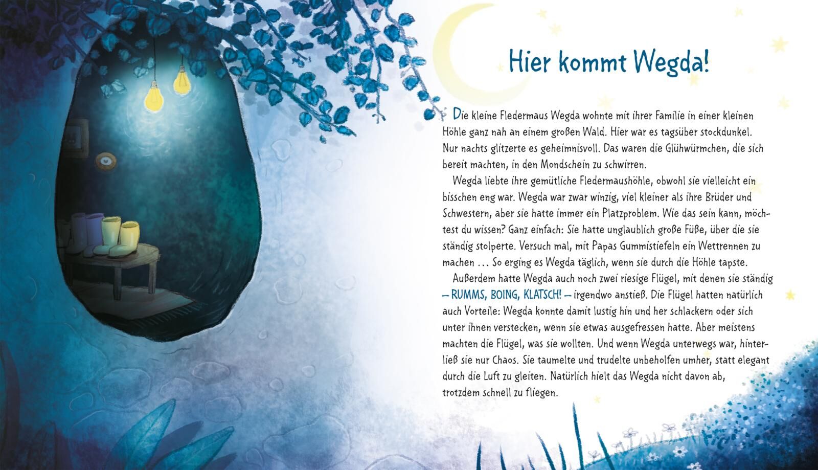 Gut einschlafen mit der kleinen Fledermaus Wegda! Wegda ist so gar nicht fledermausig: Sie ist ziemlich tollpatschig, hat riesige Füße und will nachts nicht wach sein, sondern schlafen! Das hat es noch nie gegeben. Aber Wegda ist das egal. Sie liebt es zu trä...