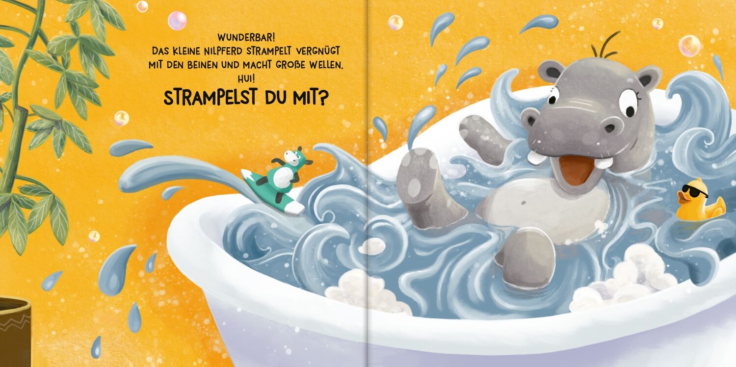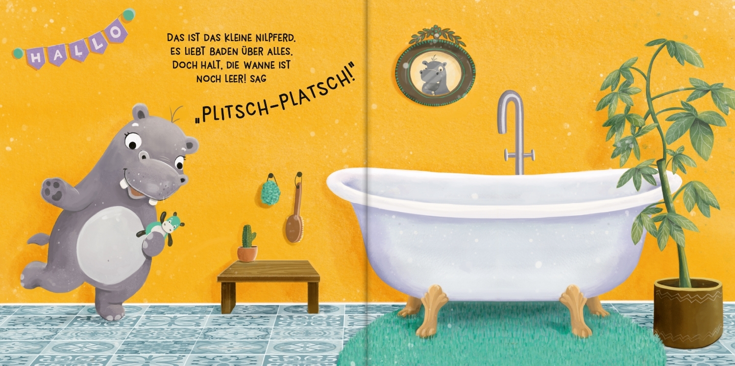 Hurra, endlich Badetag! Das kleine Nilpferd freut sich riesig, denn es ist eine echte Wasserratte. Doch was ist das? Die Wanne ist ja noch ganz leer. Wo ist denn die Seife? Durch Schütteln, Klatschen und Stupsen kann dem Nilpferd geholfen werden, und so wird ...