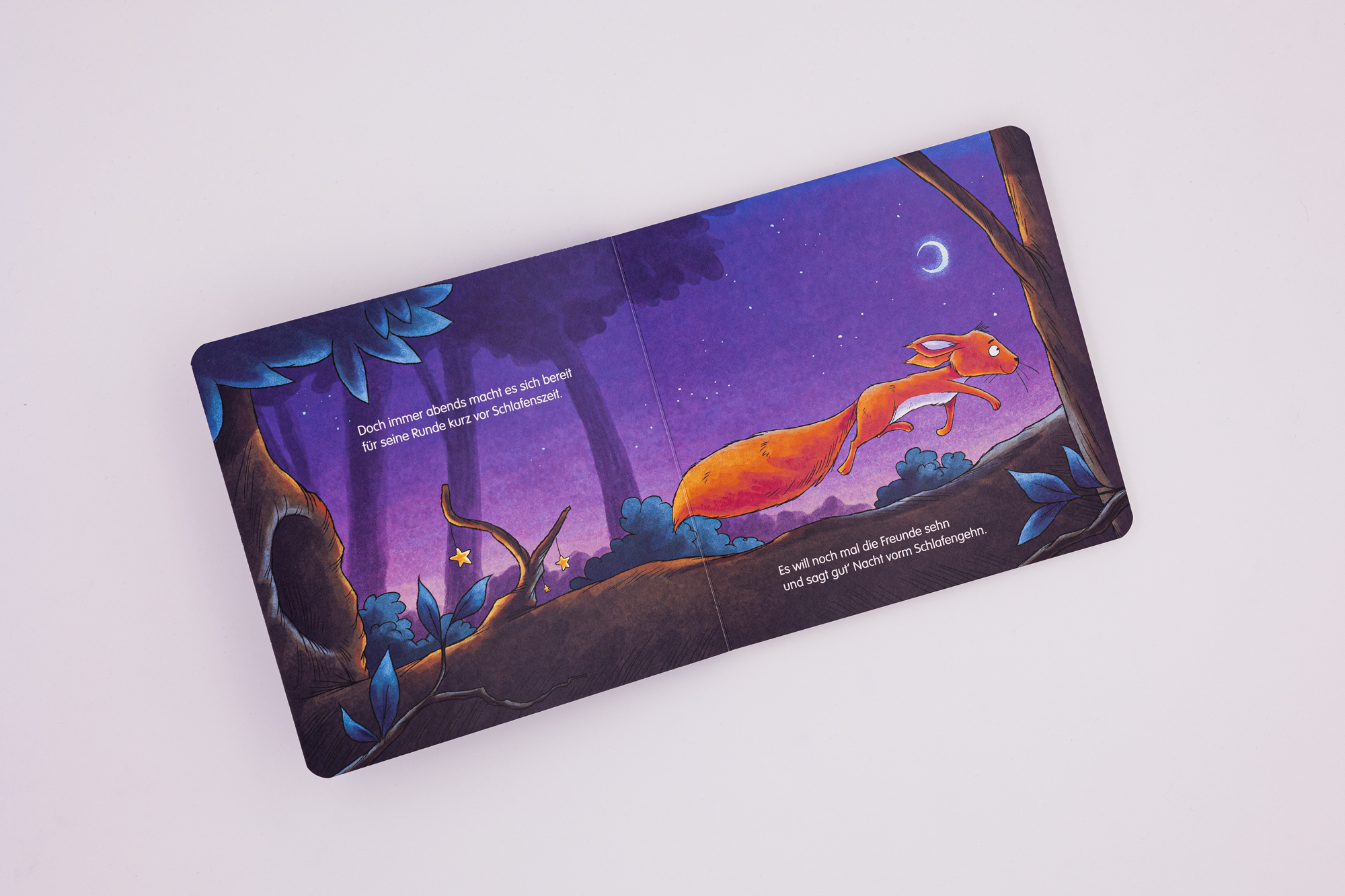 Ein aufregender Tag im Wald geht zu Ende und alle Tiere gehen nun ins Bett. Das kleine Eichhörnchen besucht noch Reh, Specht und Wildschweine und wünscht allen: Gute Nacht! Ein liebevolles Gute-Nacht-Buch mit Einschlafritualen für kleine Tier-Fans. Stimmungsvo...