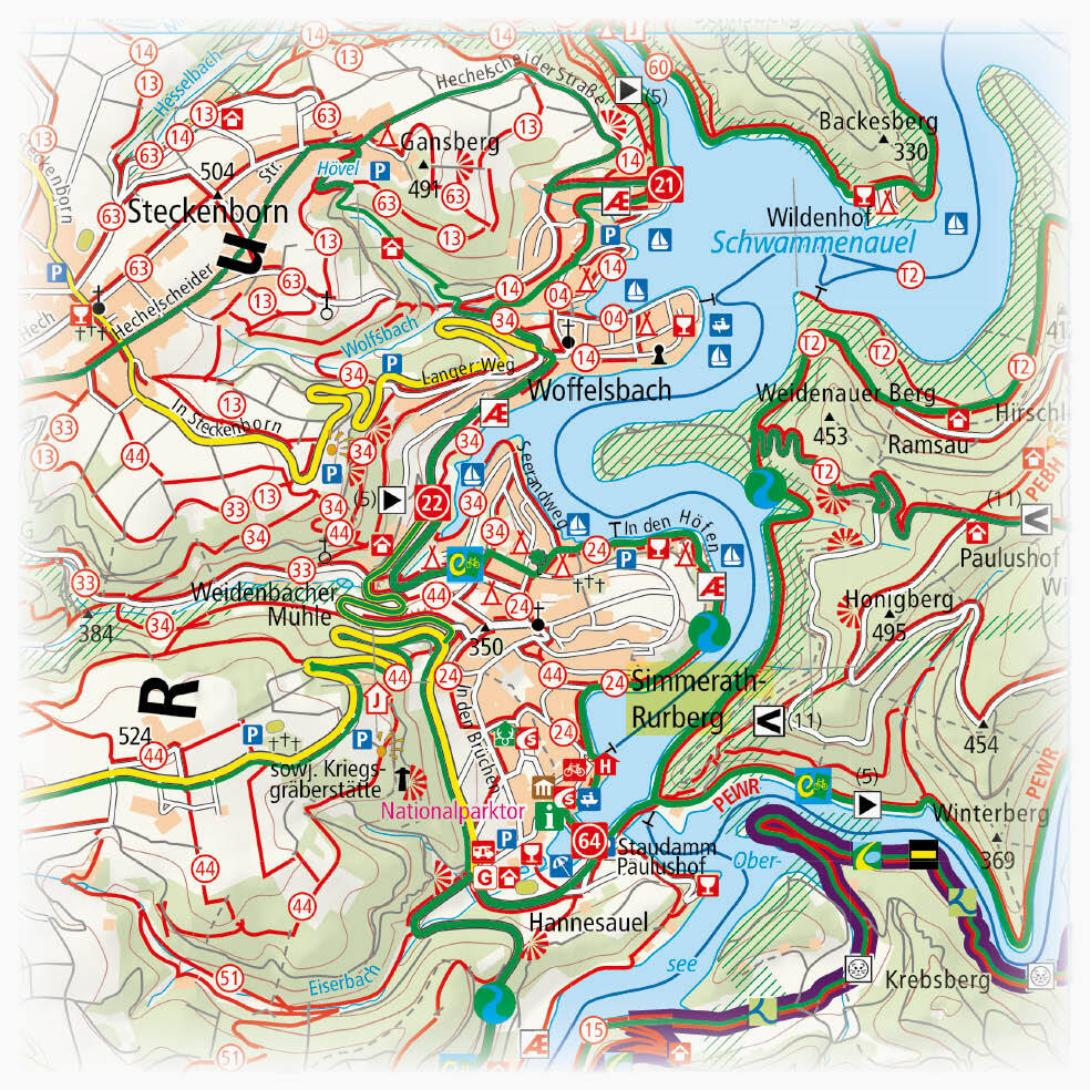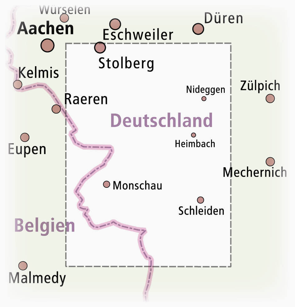 Der deutsch-belgische Naturpark Hohes Venn - Eifel und der Naturpark Eifel bilden den Mittelpunkt des Kartenausschnitts. Viele grenzüberschreitende Rad- und Wanderwege lassen die abwechslungsreiche Landschaft erkunden: bewaldete Bergrücken, Hochmoorlandschaft ...