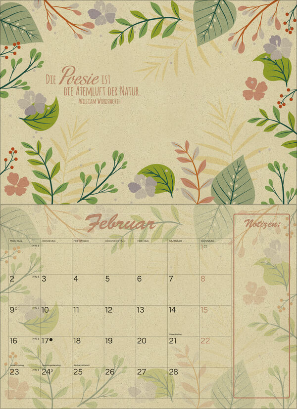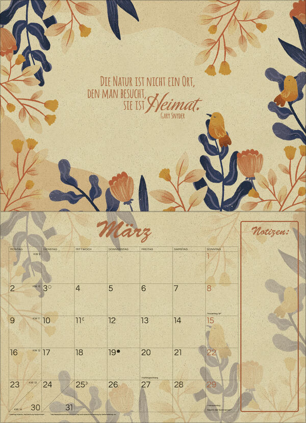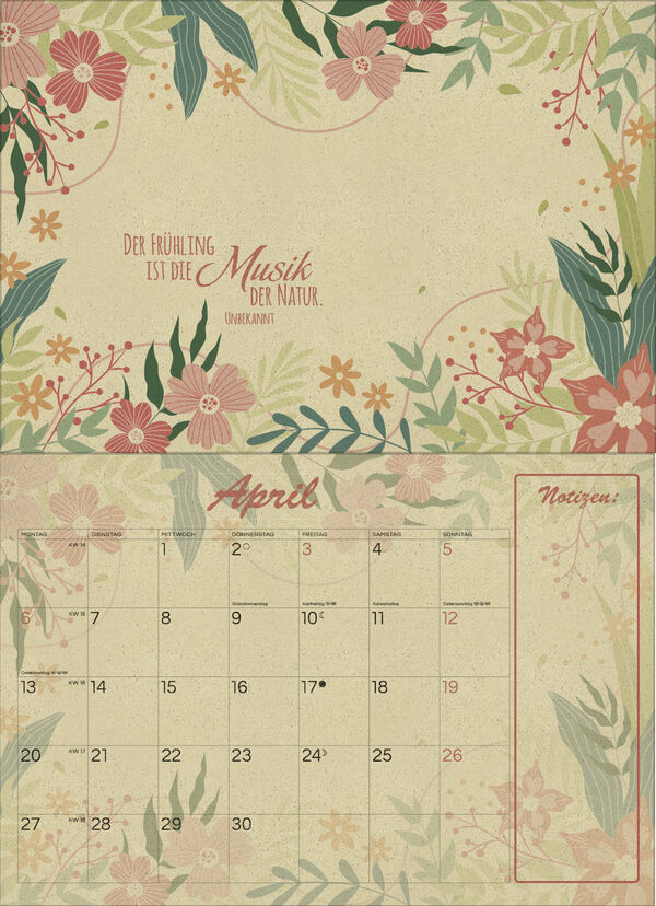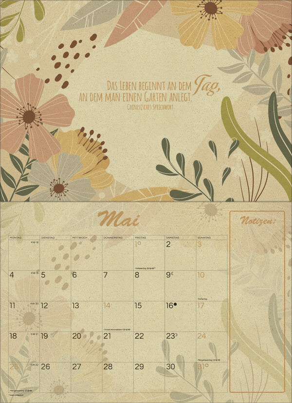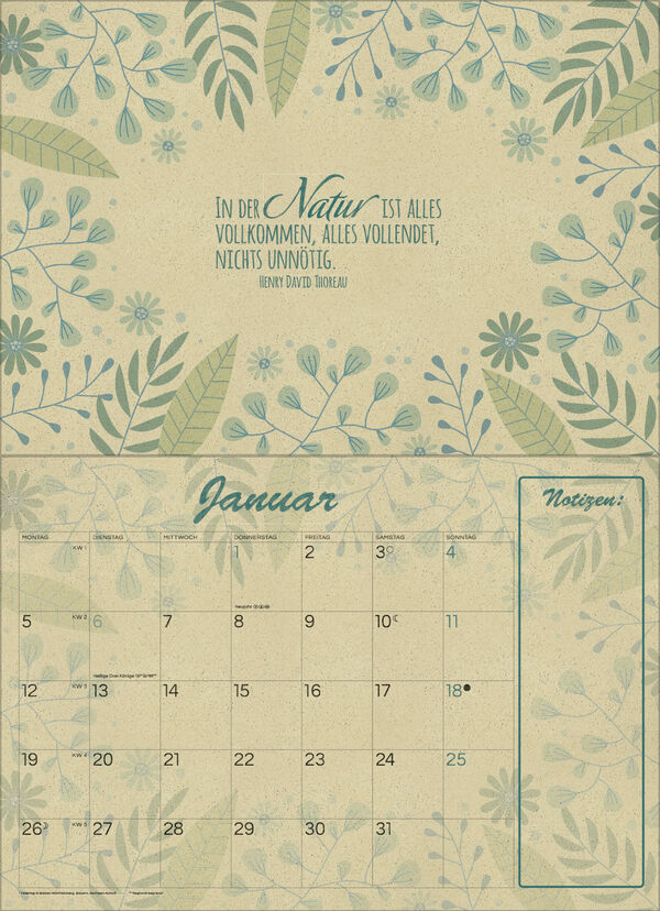 Produktmerkmale Wandkalender im Format: 30 x 30 cm; Offenes Format: 30 x 60 cm; umweltfreundliches FSC Papier Jede Kalenderseite mit großem Bild und viel Platz im Kalendarium für Notizen und Termine Mehrsprachiges Kalendarium: DE/GB/FR/IT/ES mit Feiertagen für...