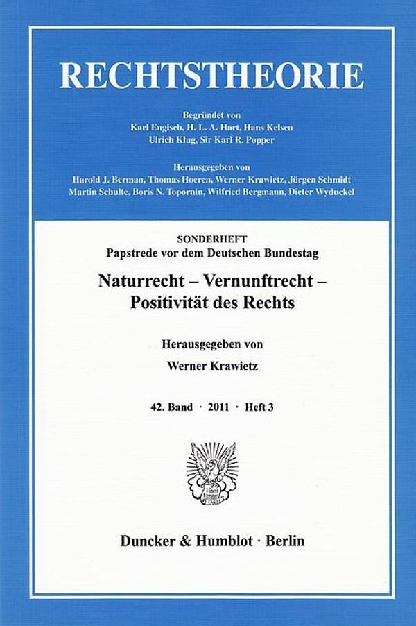 Man muß nicht Prophet sein, um schon heute sagen zu können, daß Papst Benedikt XVI. in seiner Ansprache vor dem Deutschen Bundestag am 22. September 2011 aus der Perspektive seiner Rechtsphilosophie und Rechtstheologie den Ablauf und die wichtigsten Phasen in ...Man muß nicht Prophet sein, um schon heute sagen zu können, daß Papst Benedikt XVI. in seiner Ansprache vor dem Deutschen Bundestag am 22. September 2011 aus der Perspektive seiner Rechtsphilosophie und Rechtstheologie den Ablauf und die wichtigsten Phasen in der Entwicklung des modernen Rechts bis hinein ins 21. Jahrhundert in luzider Klarheit und in einer authentischen Weise dokumentiert und vertreten hat, die noch lange nachwirken und die künftigen Auseinandersetzungen um den richtigen Begriff des Rechts maßgeblich mitbestimmen wird. Sie steht deshalb im Fokus dieses Sonderhefts. Wer heute am Aufbau einer allgemeinen Rechtstheorie interessiert ist, die zumindest ihrem Anspruch nach mit allen auf der Welt existierenden Rechtssytemen kompatibel erscheint, kann nicht umhin, jenseits aller prätendierten Renaissancen von Naturrecht sowie einem analytisch-begrifflichen Vernunft(natur)recht und dessen normativen Optimierungsversuchen und Harmonisierungsbestrebungen, eine Neubestimmung der Positivität des Rechts zu wagen. Von der Positivität allen Rechts ist hier die Rede und nicht von einem längst überständigen juristischen Positivismus, der in der Form eines Gesetzes- und Rechtspositivismus bis hin zu einem Richterrechtspositivismus noch immer das moderne »westliche« Rechtsdenken nachhaltig bestimmt und prägt, obwohl in den Rechtssystemen der modernen Gesellschaft die Modernisierung des Rechts die politisch-rechtlichen Grenzen einer einseitig westlichen »europäischen Nabelschau« transzendierend längst nicht mehr mit seiner Verwestlichung gleichgesetzt werden kann. Auch ist in der modernen Rechtstheorie die vermeintlich universale Frage nach der guten und gerechten Ordnung des Gemeinwesens als eine in ihrem Grunde vormoderne Orientierung und Leitformel durchschaut, die das Verhältnis von Recht und Moral auf Dauer nicht mehr in Einklang zu bringen vermag. In weltgesellschaftlicher Perspektive wächst heute bei der Neubestimmung des Verhältnisses von Gesetz und Recht die Vorstellung und mit ihr die Einsicht, daß in der modernen Globalgesellschaft das Rechtssystem nicht primär und jedenfalls nicht ausschließlich ein System von Rechten ist, sondern ein normativ-strukturell differenziertes Funktionssystem und Mix objektiven Rechts und subjektiver Rechte, in dem nicht bloß in der Rechtsanwendung ein normativ-faktischer wertender Ausgleich von Interessen und ihrer konfliktreichen rechtspflichtgemäßen Verfolgung auch unter den sozialen Bedingungen fehlender Gleichheit und eingeschränkter Freiheiten zu gewährleisten und zu sichern ist. Die sich hier vollziehende perspektivische rechts- und gesellschaftstheoretische Erweiterung des Rechtsbegriffs kommt nicht nur der Rechtstheorie zugute, sondern sie erweist sich auch als fruchtbar für das inter- und multidisziplinäre Gespräch der Jurisprudenz mit den an der theoretischen Aufklärung allen Rechts und seiner Anwendung beteiligten sozialen Handlungswissenschaften. Werner Krawietz
