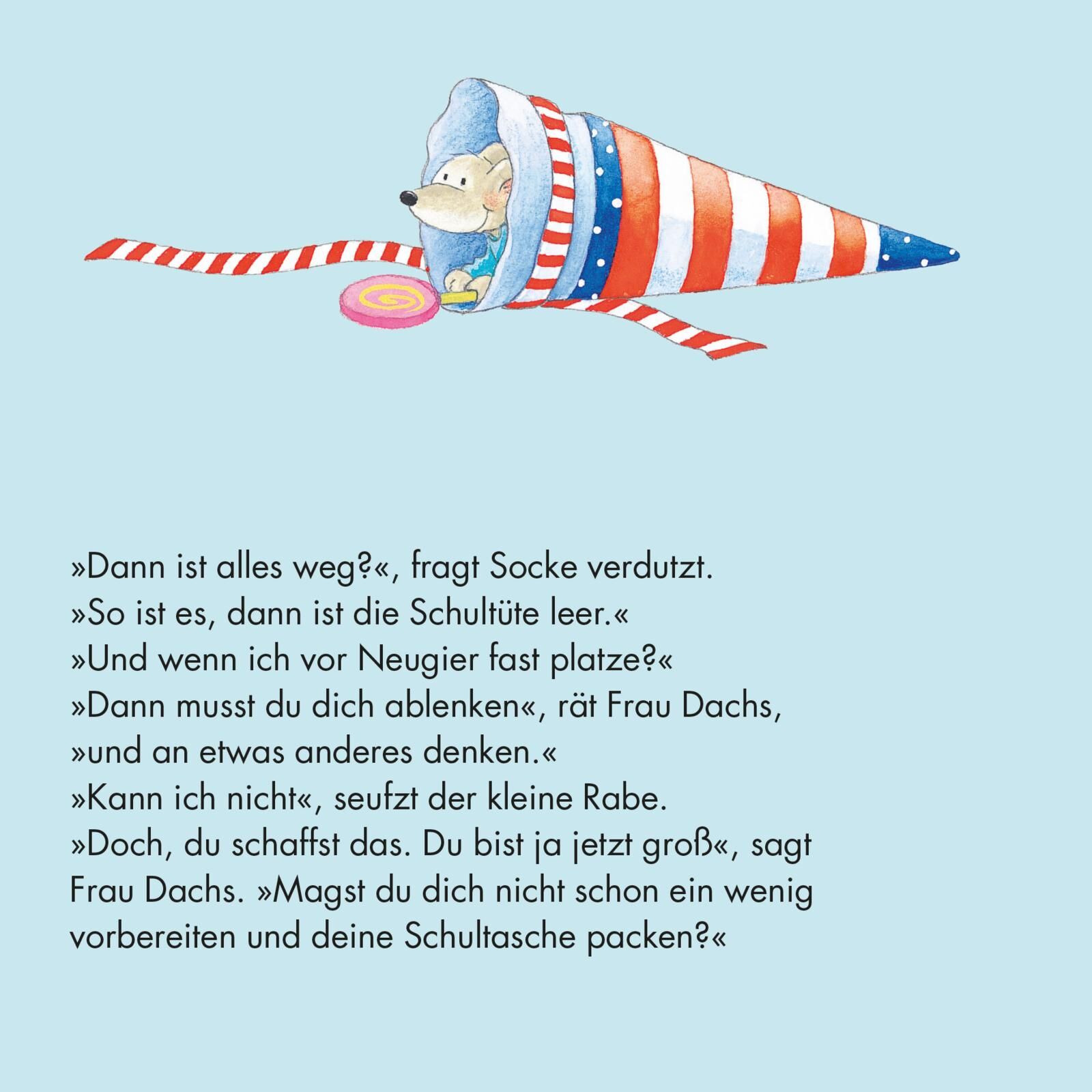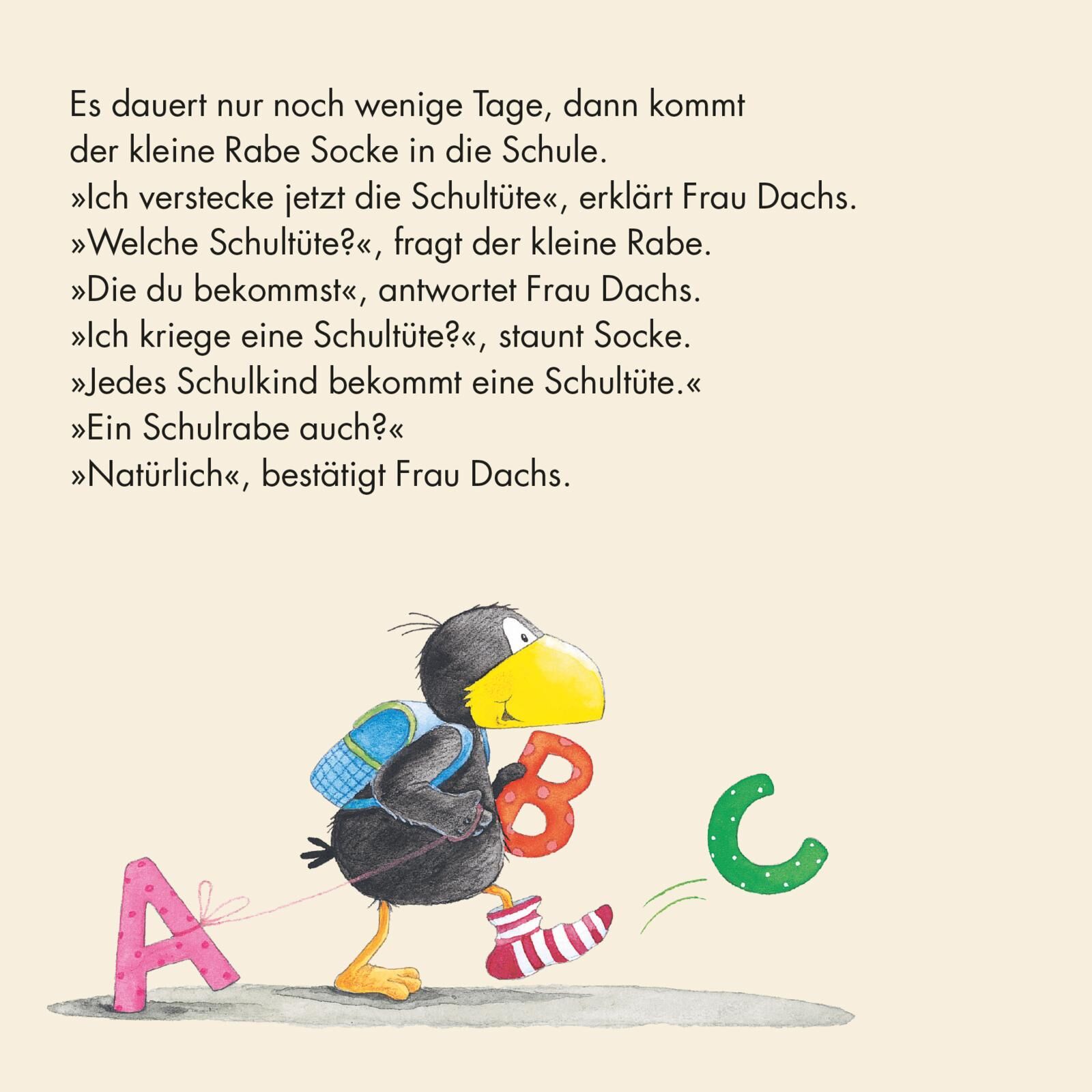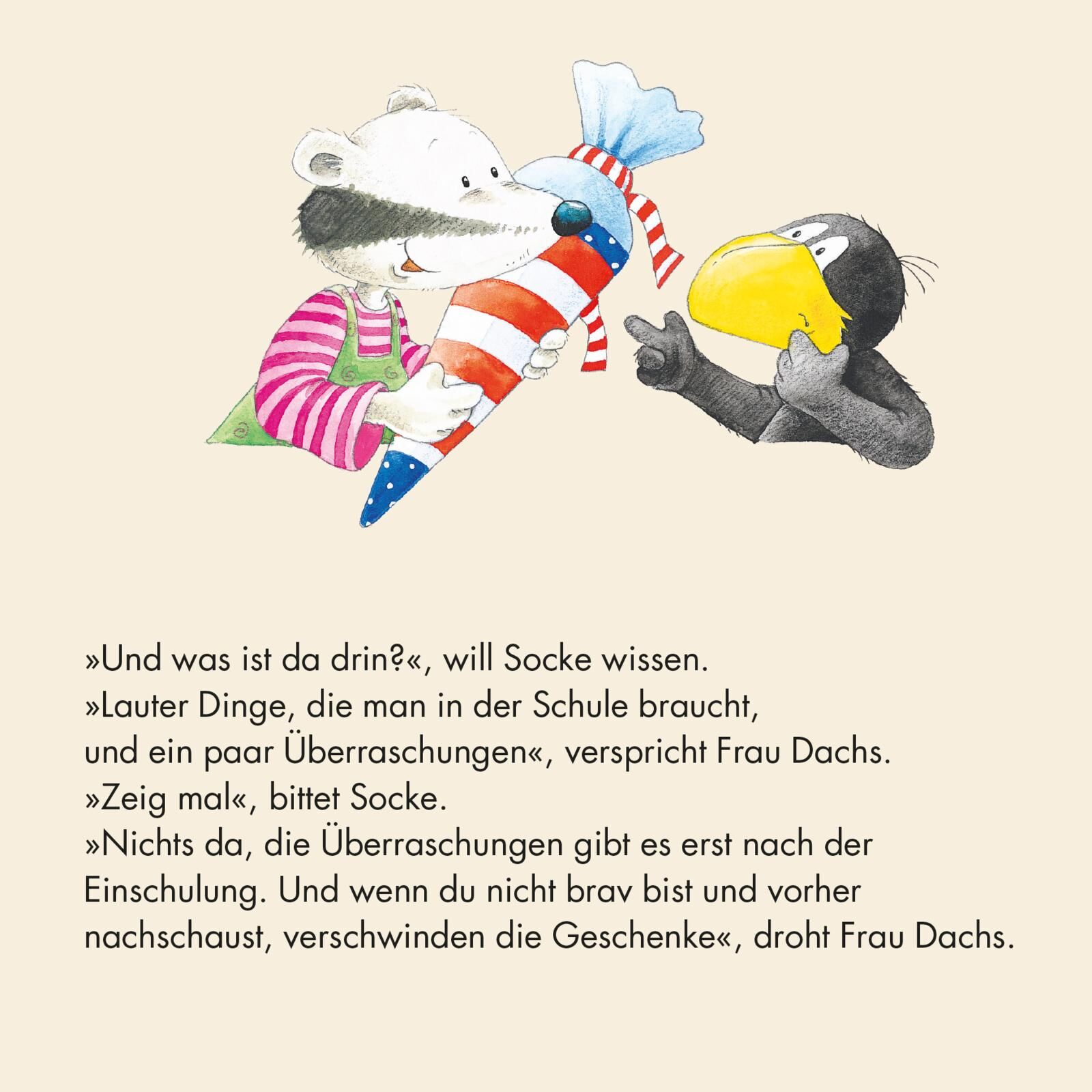 Hurra, der kleiner Rabe Socke kommt in die Schule! Erst packt Socke viele ganz wichtige Sachen in den Schulranzen, die Frau Dachs alle wieder aussortiert. Und dann wacht er vor Aufregung am ersten Schultag viel zu früh auf und erlebt eine besondere Überraschu...