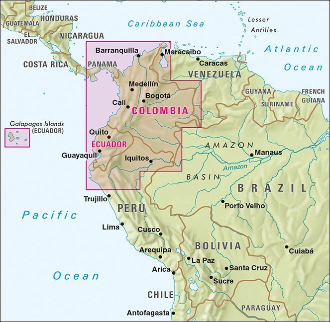 Landkarte mit Schummerung, Nebenkarten, Stadtplänen, touristischen Sehenswürdigkeiten, Kilometrierung. Autorentext Bogota 1: 15,000 Stadtplan Cartagena 1: 15,000 Stadtplan Cuenca 1: 12,000 Stadtplan Galapagos Islands 1: 2,500,000 Detail- / Übersichtskarte Guay...