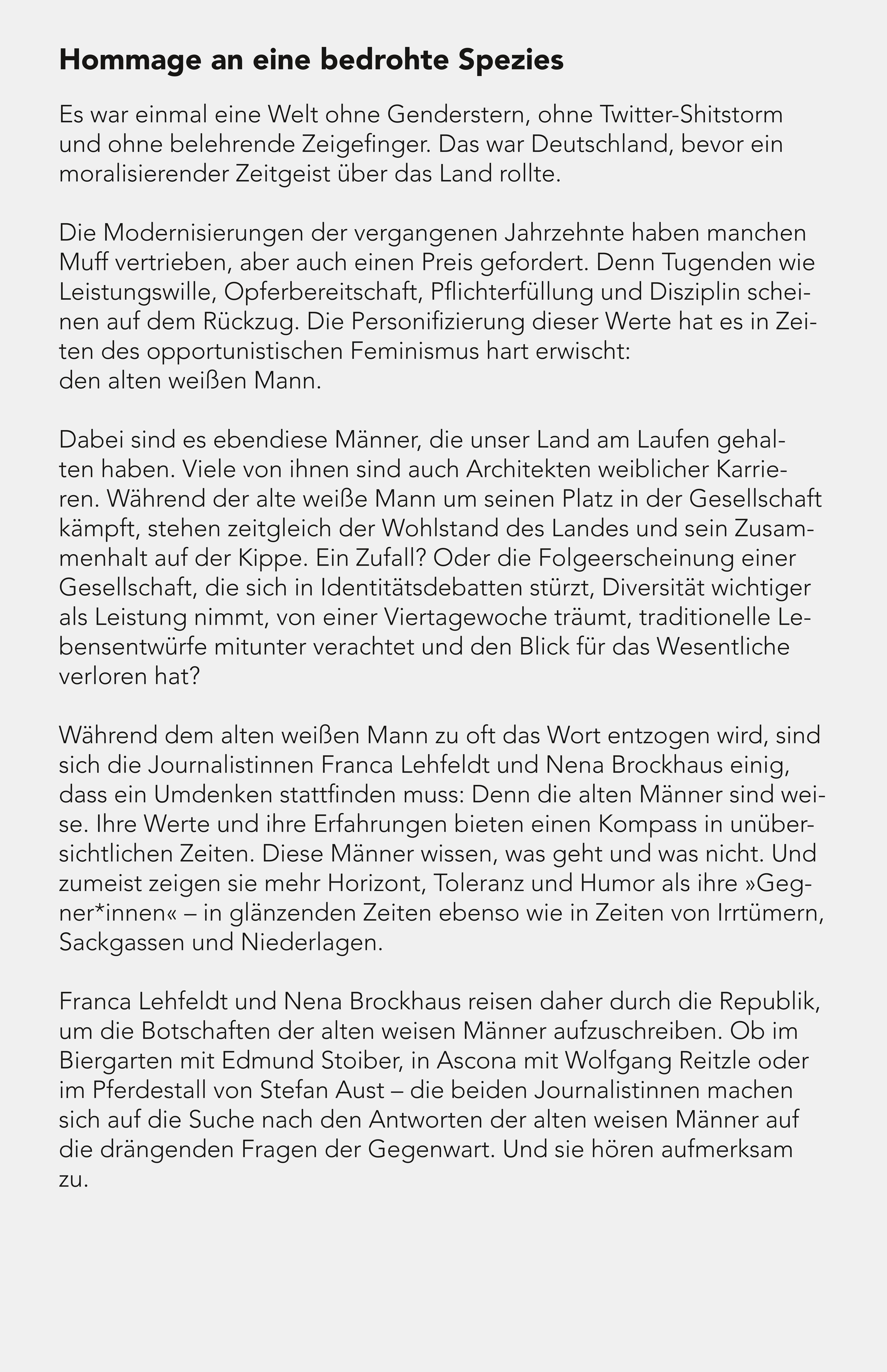 ALTE WEISE MÄNNER ist der mutige Einspruch der Politikjournalistinnen Nena Brockhaus und Franca Lehfeldt gegen den Zeitgeist des Woke-Washing und die pauschale Männerkritik. Ihr Argument: Lebensleistung. Tugenden wie Leistungswille, Opferbereitschaft und Diszi...