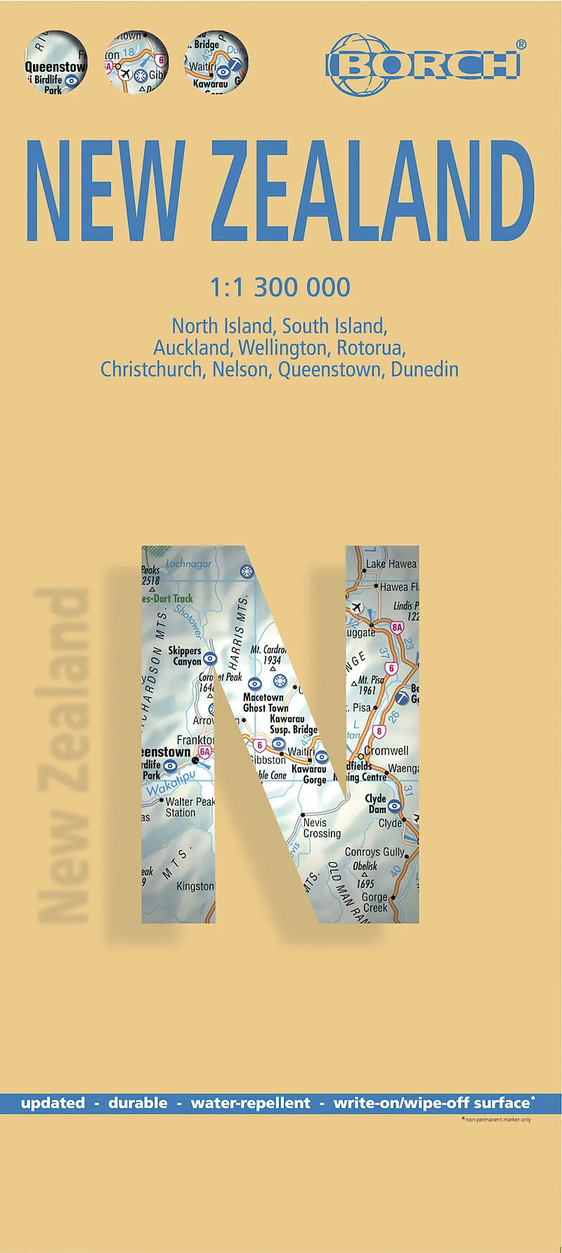 Our laminated and folded Borch Map of New Zealand in the 11th edition contains: North Island 1:1 300 000, South Island 1:1 300 000, Auckland 1:20 000, Christchurch 1:20 000, Dunedin 1:15 000, Nelson 1:15 000, Rotorua 1:15 000, Queenstown 1:15 000, Wellington 1...