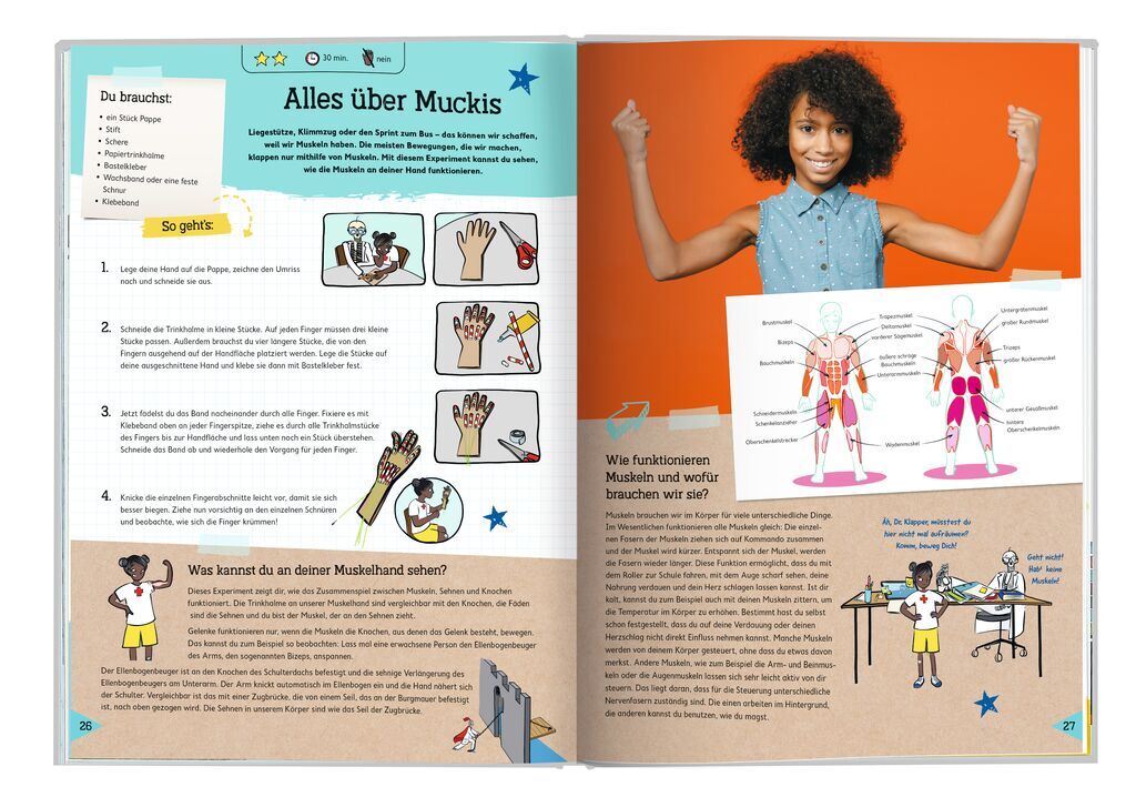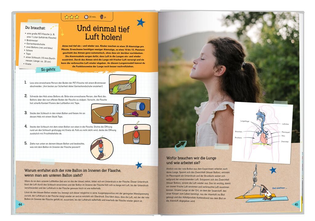 Körper-Bücher gibt es viele. Aber keines, bei dem man anhand anschaulicher Experimente die Funktionsweise der Organe, Knochen, Zellen und anderer Körperteile nachvollziehen kann! Baue aus Flasche und Luftballon ein Lungenmodell, aus zwei Bällen und einem Stab ...